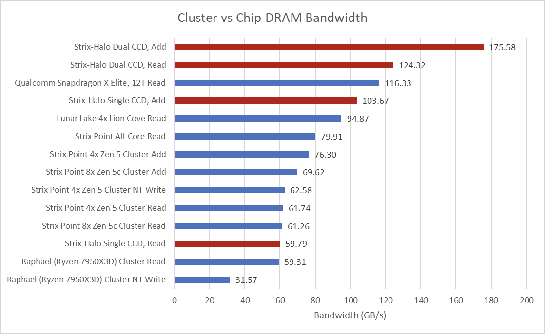 Moving on to memory bandwidth, we see Strix Halo fall into a category of its own of the SoCs we have tested.