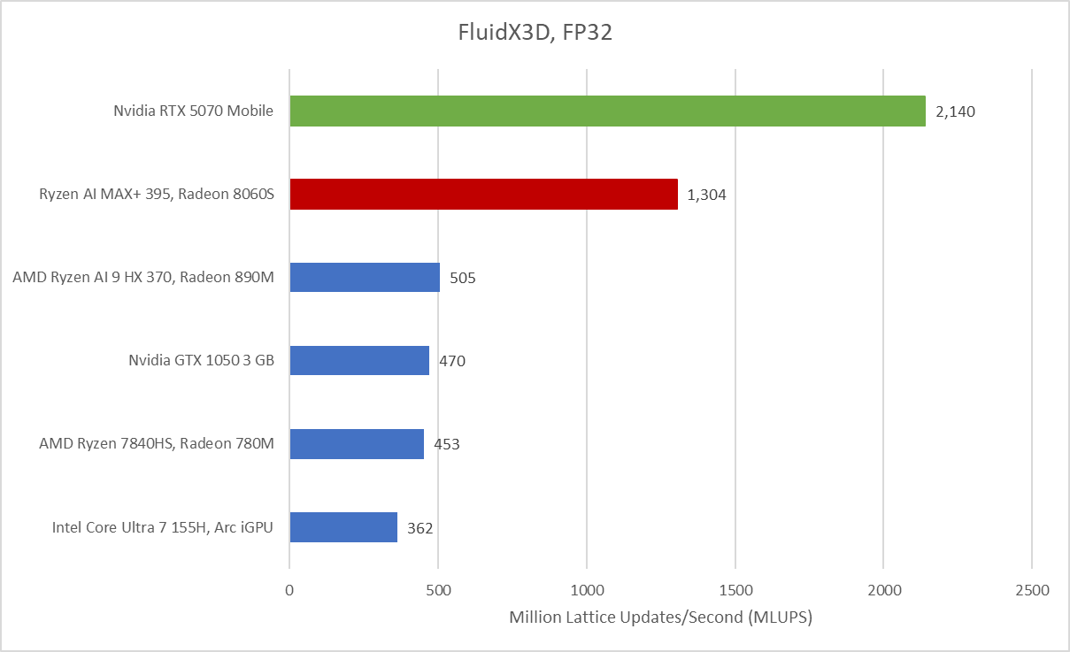 Looking at Fluid X3D for a compute-heavy workload, we can see the Radeon 8060S absolutely obliterates the other iGPU’s from Intel/AMD, putting itself firmly in a class above. The 5070 is no slouch though, and still holds a substantial 64.1% lead largely due to the higher memory bandwidth afforded to the 5070M.