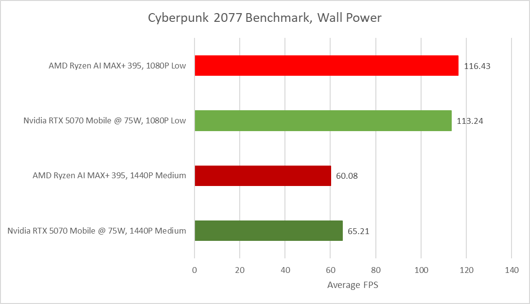 Finally, moving to wall power and allowing both the Radeon 8060S and 5070M to access the full power limit in CP2077, we can see that the 8060S still pulls ahead at 1080p low by 2.5%, while at 1440p medium we see a reversal, with the 5070M commanding an 8.3% lead. Overall the two provide a comparable experience in Cyberpunk 2077, with changes in settings or power limits adjusting the lead between the two. This is a seriously impressive turnaround for an iGPU working against dedicated graphics, and demonstrates the versatility of the chip in workloads like gaming, where iGPU’s have traditionally struggled.