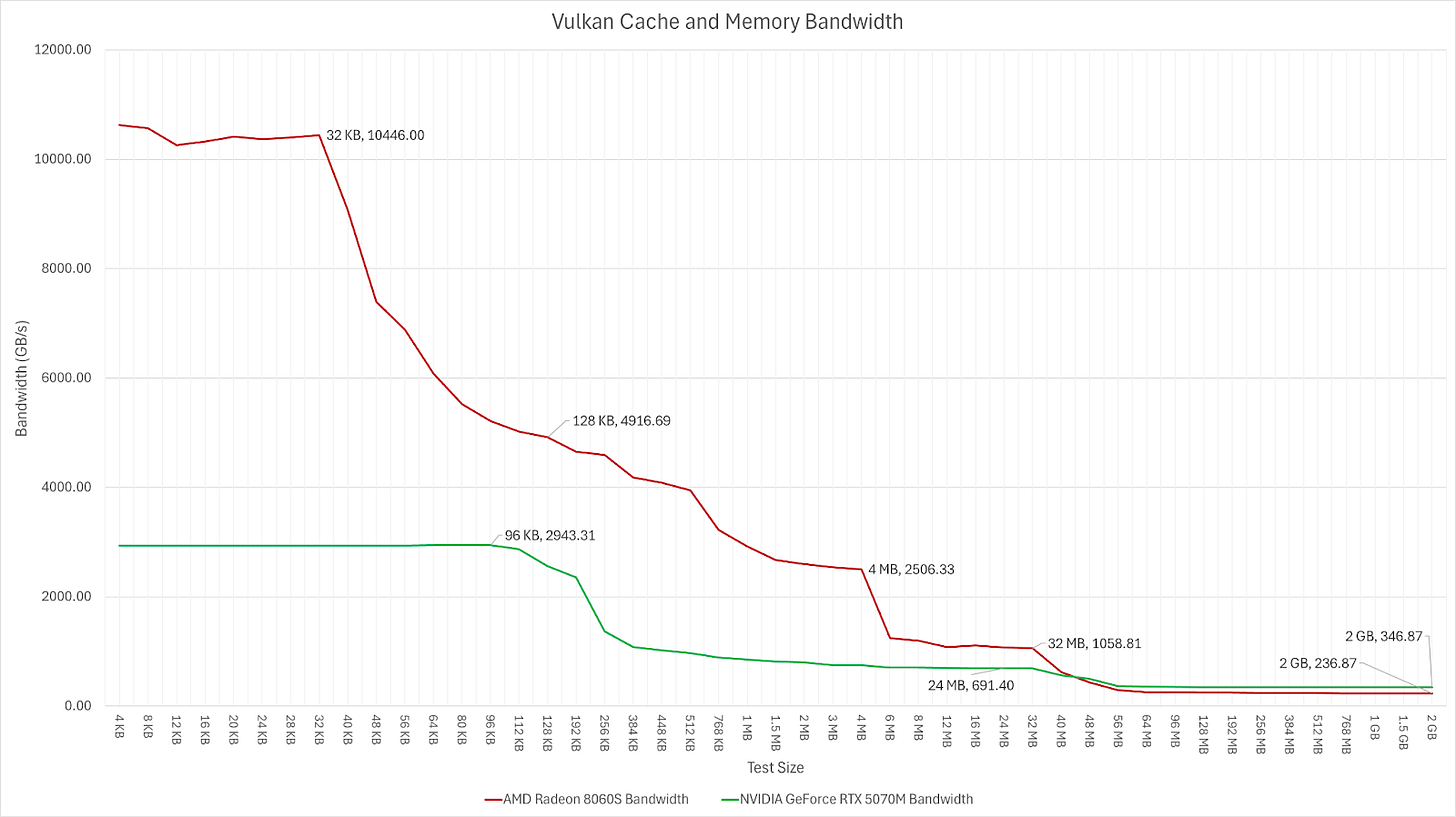 Looking at the caches of Strix Halo, the Infinity Cache, AKA MALL, is able to deliver over 40% higher bandwidth compared to the 5070M’s L2 while having 33% more capacity. Plus Strix Halo has a 4MB L2 which is capable of providing 2.5TB/s of bandwidth to the GPU.