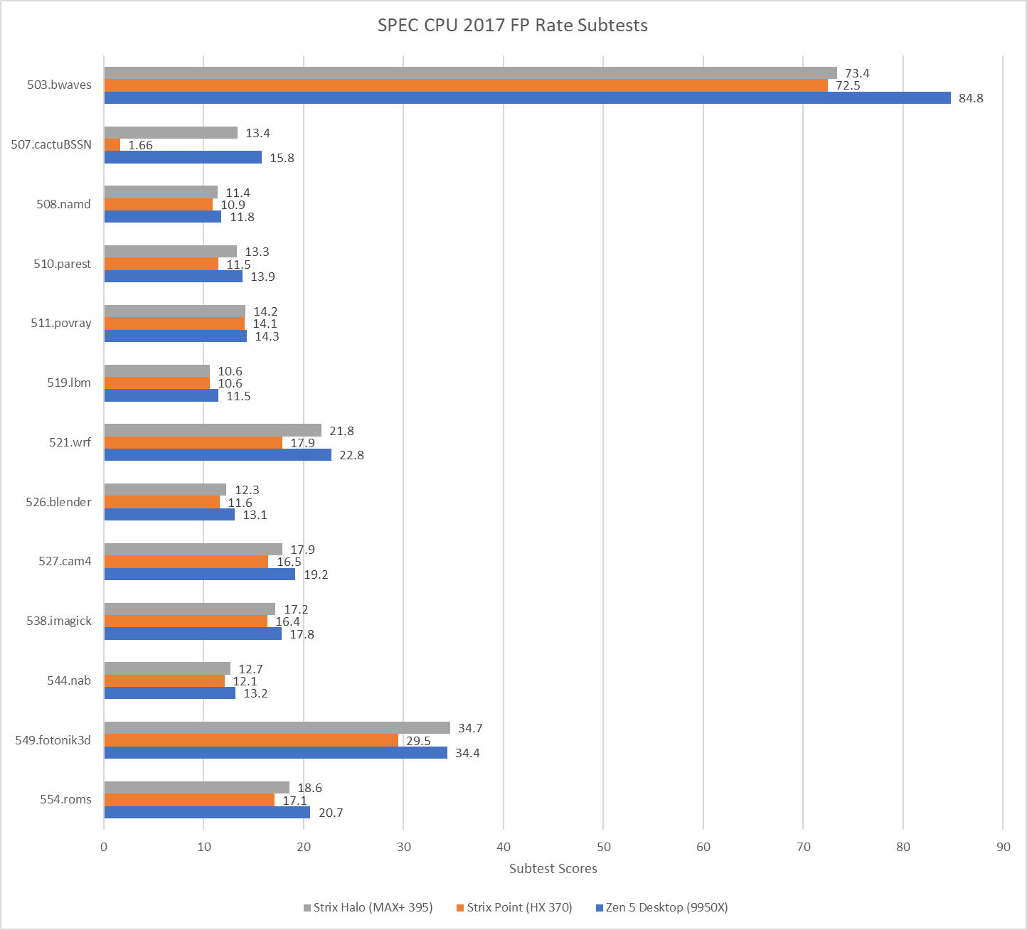 Moving to the FP subtests and the story is similar to the Integer subtests but Strix Halo can get even closer to the 9950X and even beat it in the fotonik3d subtest.