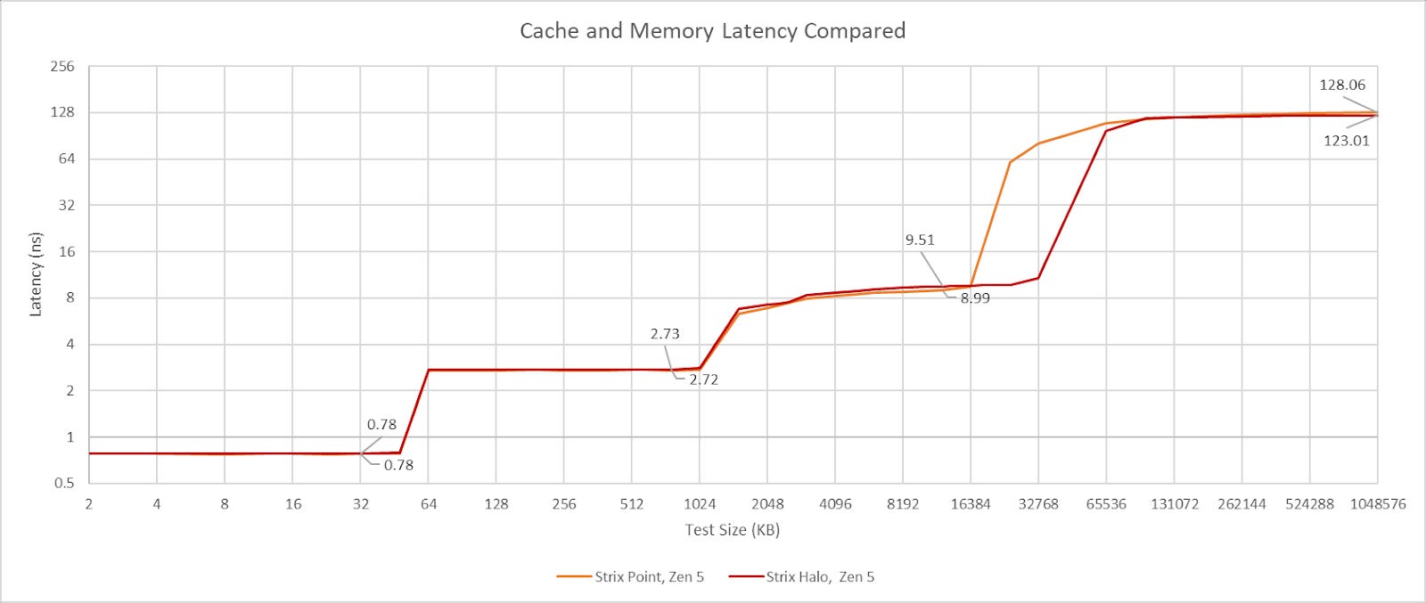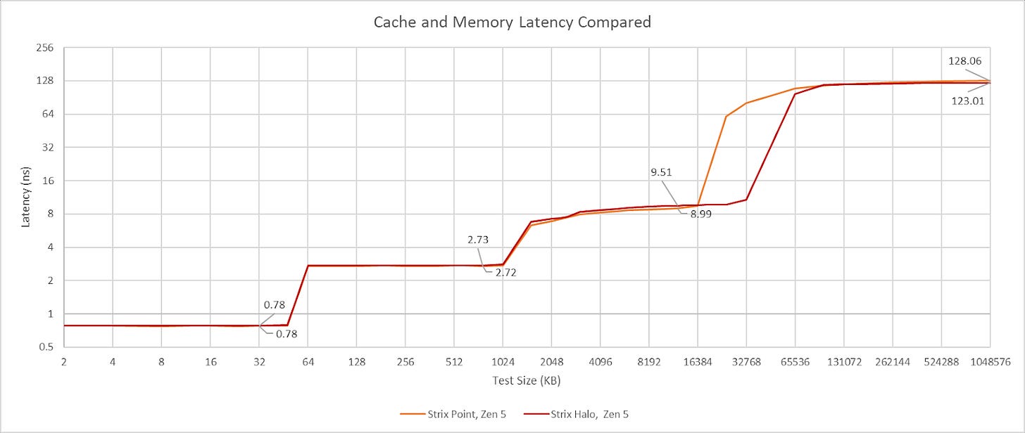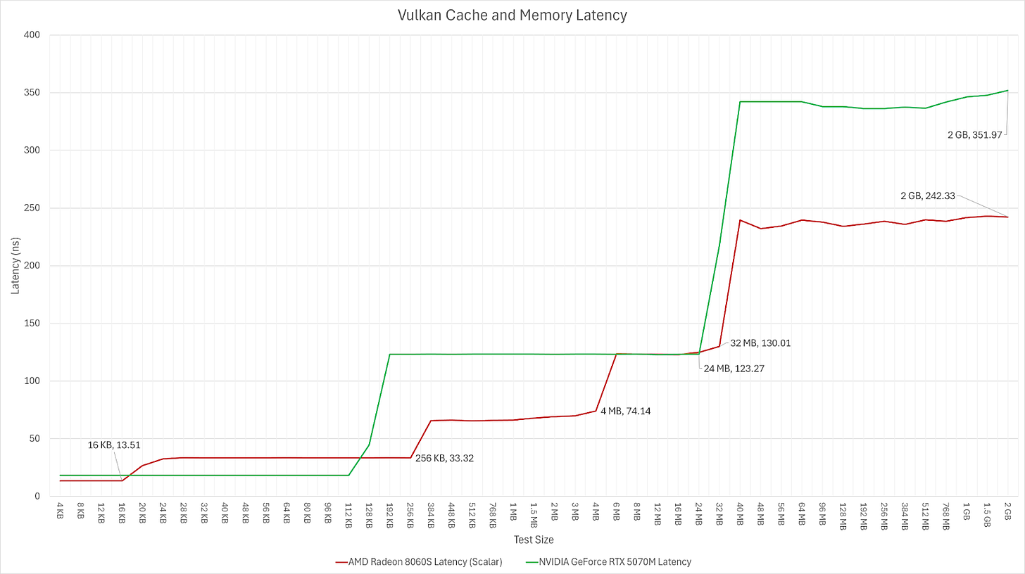 Moving to the latency, the more complex cache layout of Strix Halo does give it a latency advantage after the 128KB with Strix Halo’s L2 being significantly lower latency than the 5070M’s L2 and the larger 32MB MALL that Strix Halo has a similar latency to the 5070M’s L2. And Strix Halo’s memory latency is about 35% lower than the 5070M’s memory latency.