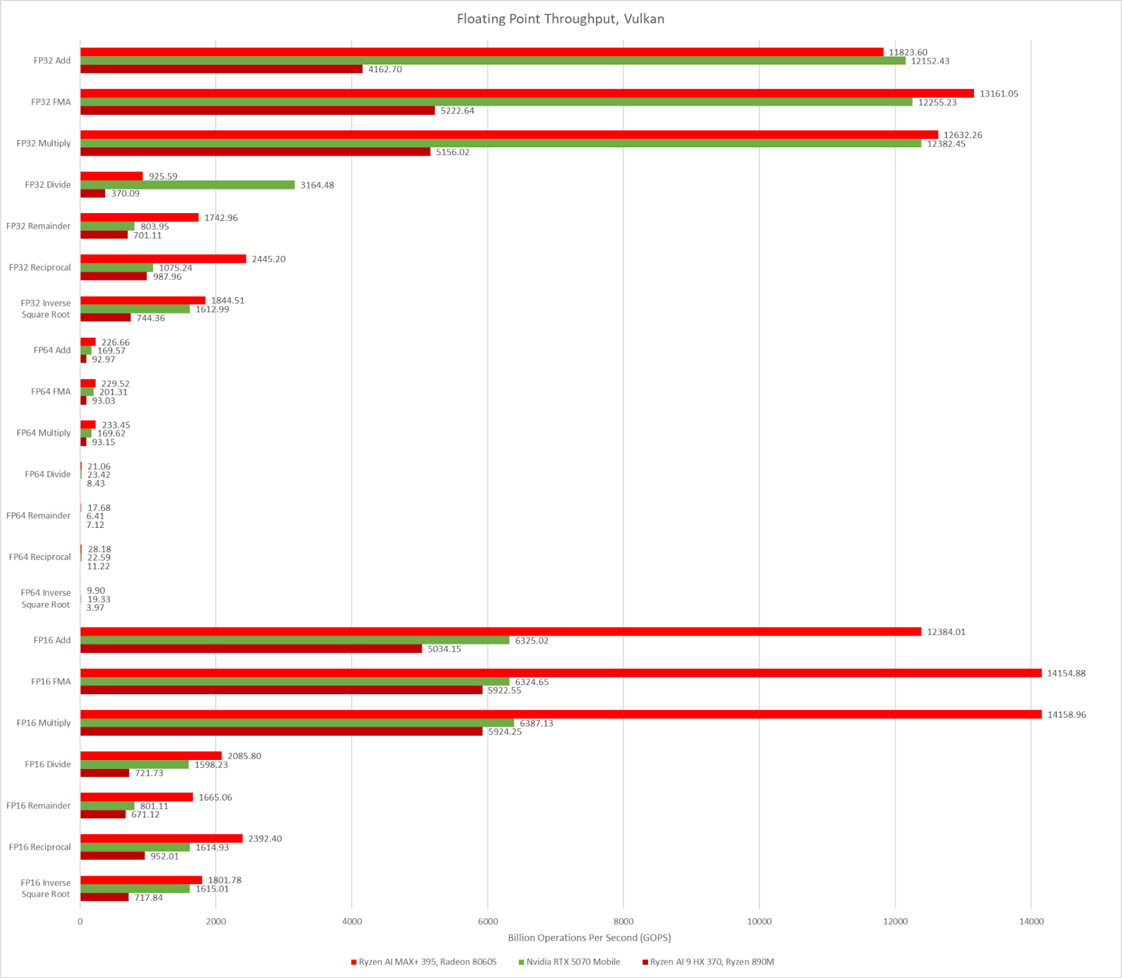 Looking at the floating point throughput, we see that Strix Halo unsurprisingly has about 2.5x the throughput of Strix Point considering it has about two and a half times the number of Compute Units. Strix Halo oftentimes can match or even pull ahead of the 5070 Mobile in terms of throughput. I will note that the FP16 results for the 5070 Mobile are half of what I would expect; the FP16:FP32 ratio for the 5070 Mobile should be 1:1 so I am not positive about what is going on there.