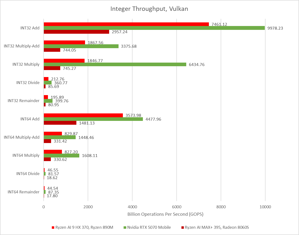 Moving to the integer throughput and we see the 5070 Mobile soundly pulling ahead of the Radeon 8060S.