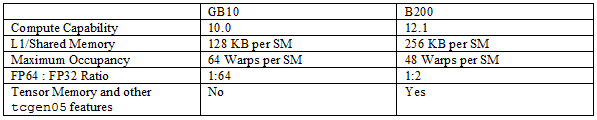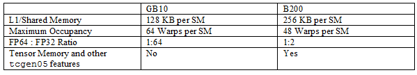 GB10’s GPU uses Blackwell’s consumer variant. It supports compute capability 12.1, putting under the same column that describes Nvidia’s RTX 5xxx consumer GPUs in Nvidia's chart. B200 in contrast has compute capability 10.0. Compared to GB10’s SMs, datacenter variants can keep more work in flight, have more L1/Shared Memory, and more FP64 units. 5th generation Tensor Core features are also limited to the datacenter variant.