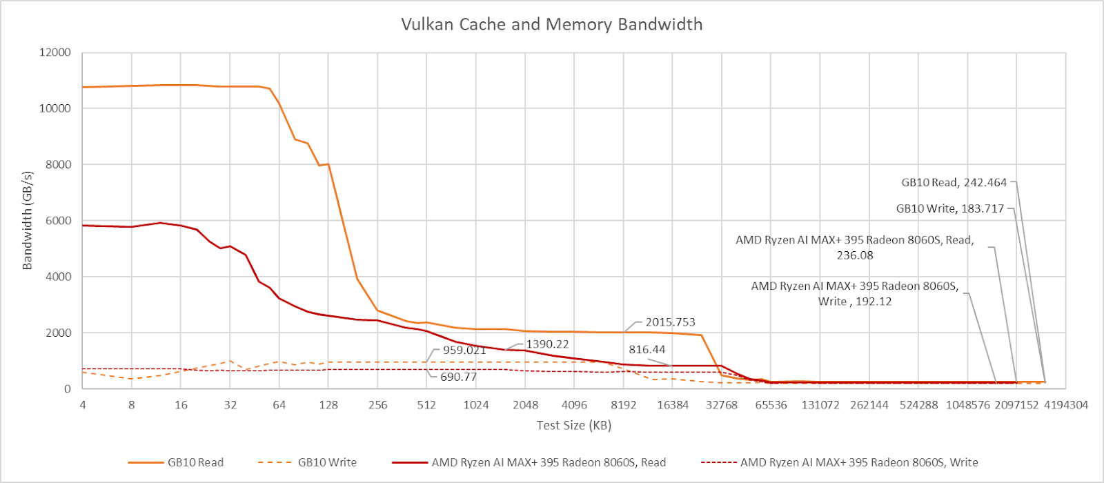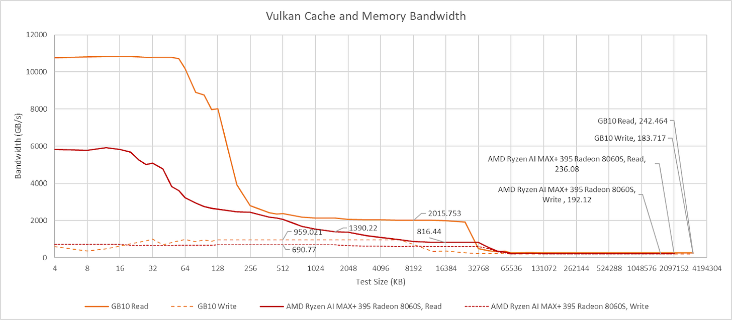 GB10’s GPU-side memory subsystem brings few surprises. It’s basically a Blackwell GPU integrated, with a familiar two-level caching setup. The L2 serves as both a high capacity last level cache and the first stop for L1 misses. AMD in contrast uses more cache levels and gradually increasing cache capacity at each level, which mirrors their discrete GPUs too. In a cache and memory latency test, GB10 and Strix Halo trade blows depending on test size. Larger caches are hard to optimize for high performance, so AMD wins when it’s able to hit in its smaller 256 KB L1 or 2 MB L2 compared to Nvidia’s higher latency 24 MB L2. Nvidia wins when GB10 can keep accesses within L2 while AMD has to service them out of Strix Halo’s 32 MB memory side cache. Both Strix Halo and GB10 use LPDDR5X memory. Strix Halo’s iGPU enjoys better latency to LPDDR5X than Nvidia’s GB10, reversing the situation seen on the CPU side.