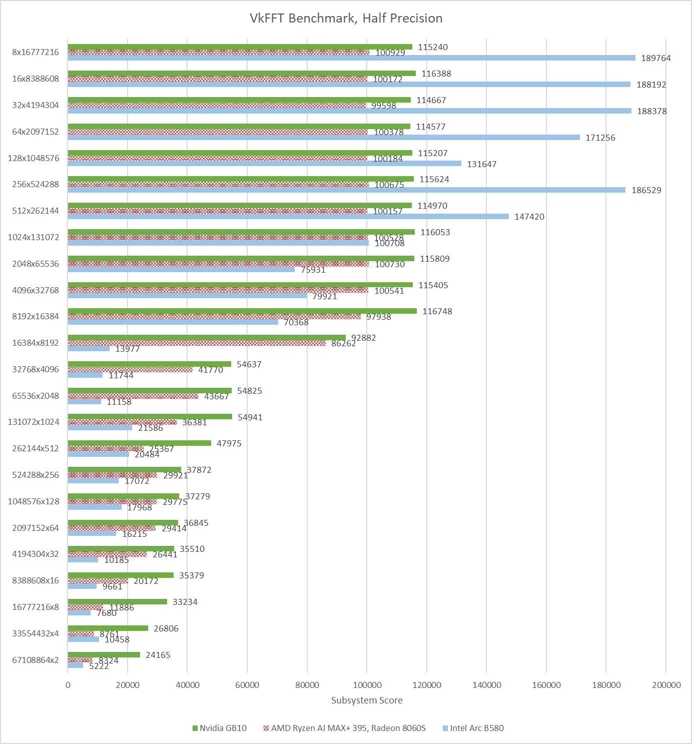 VkFFT can also target double precision (FP64) and half precision (FP16). GB10 is able to take an overall lead with double precision, while Strix Halo still can’t pull ahead in any test. Intel’s B580 can use its bandwidth advantage to win in some configurations, but not enough to get an overall score lead. None of the three GPUs here have strong FP64 performance, but VkFFT is often memory bound. The primary challenge is feeding the execution units, not having more of them.