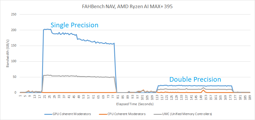 GB10 easily tops FAHBench’s workloads in single precision mode. FAHBench makes good use of local memory to keep data on-chip, reducing pressure on the global memory hierarchy. Global memory accesses that do happen have reasonable locality, even on the heavier NAV workload. Data Fabric performance monitoring on Strix Halo shows about 200 GB/s of GPU memory requests, and ~50 GB/s of traffic at the Unified Memory Controllers. That implies Strix Halo’s 32 MB system level cache caught about 150 GB/s of memory traffic. GB10’s 24 MB L2 is likely almost as effective, which would mean Nvidia also avoids DRAM bandwidth bottlenecks.