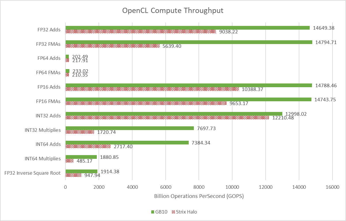 Both GPUs have low FP64 throughput, another characteristic that sets them apart from datacenter ones. GB10 has a 1:64 FP64 to FP32 ratio, while Strix Halo has a 1:32 ratio.
