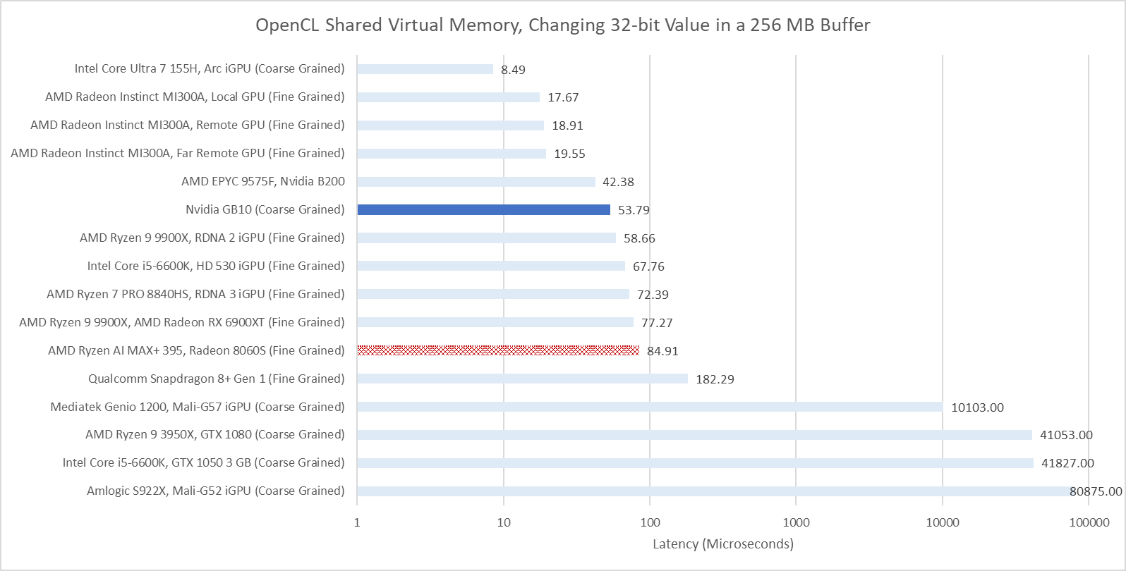 Like many modern GPUs, GB10 supports OpenCL’s Shared Virtual Memory (SVM) feature. SVM allows seamless pointer sharing by mapping a buffer into the same virtual address space on both the CPU and GPU. GB10 supports “coarse grained” SVM, meaning the buffer cannot be simultaneously mapped on both the CPU and GPU. Some GPUs with only coarse grained SVM appear to copy the entire buffer under the hood, as can be seen with Qualcomm and Arm iGPUs. Thankfully, GB10 can handle this feature without requiring a full buffer copy under the hood.