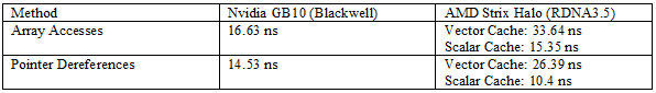 Nvidia’s L1 cache offers an impressive combination of low latency and high capacity. With dependent array accesses, it can return data nearly as fast as AMD’s 16 KB scalar cache while offering more capacity than AMD’s first level scalar and vector caches combined. However, dependent array accesses don’t tell the whole story. Pointer dereferences indicate that AMD takes a lot of overhead from array addressing calculations. Cutting that out shows that RDNA3.5’s scalar cache offers very low latency. Nvidia already had efficient array address generation, so switching to pointer dereferences makes less of a difference on GB10. Regardless of access method, GB10’s L1 offers higher capacity and lower latency than RDNA3.5’s L0 vector cache.