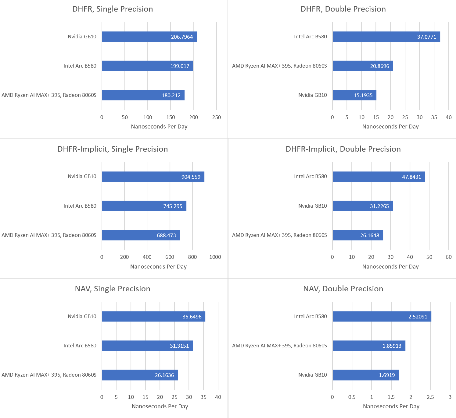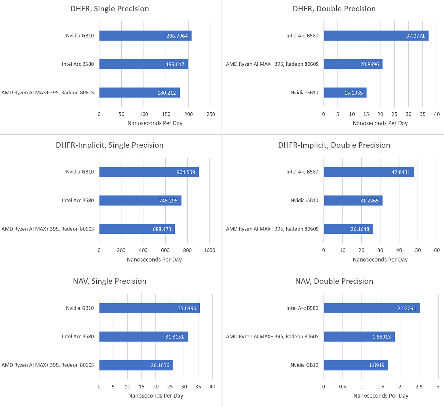 Double precision workloads on FAHBench are very compute bound on all three GPUs. Intel’s B580 has the least horrible FP64 to FP32 ratio at 1:16. Strix Halo comes next at 1:32, followed by GB10 at 1:64.