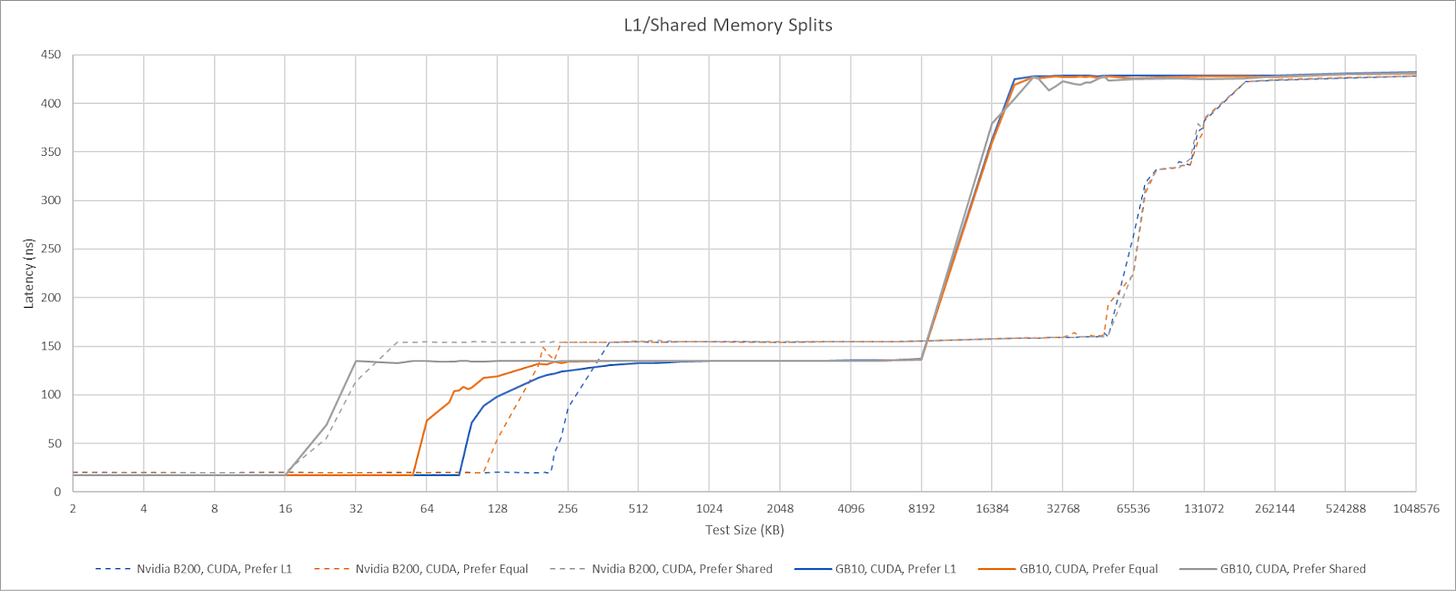 Instead, GB10 behaves much like Nvidia’s consumer Blackwell architecture and has 128 KB of L1/Shared Memory. In exchange for lower L1/Shared Memory capacity, GB10 achieves 13 ns of latency in Shared Memory using dependent array accesses. That’s slightly better than 14.84 ns for B200.
