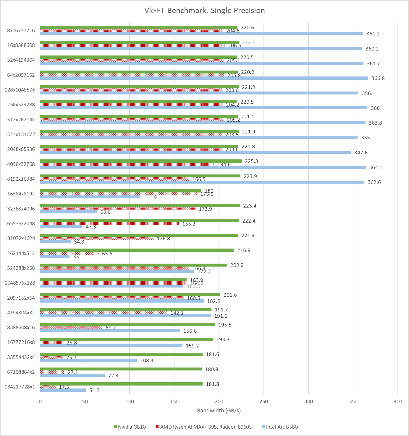 VkFFT outputs bandwidth figures alongside test results, and again shows what a discrete GPU can do with a fast, dedicated memory pool.