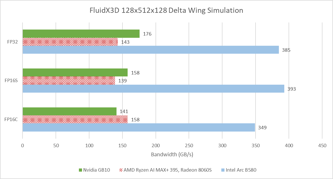 GB10 leads AMD’s Strix Halo when running FluidX3D’s delta wing simulation example with FP32, and continues to have an edge in FP16S. However, it falls behind in FP16C mode. Intel’s Arc B580 nominally sits in the same performance segment as Strix Halo, but manages a huge performance lead over both iGPUs. VRAM bandwidth is likely a factor. FluidX3D has poor memory access locality and therefore tends to be bound by VRAM bandwidth. Besides reporting simulation speed, FluidX3D outputs memory bandwidth figures that account for accesses made from its algorithm’s perspective.