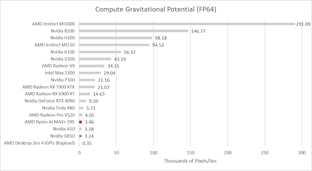 In this self-penned benchmark, I perform a brute-force gravitational potential calculation over column density values. It’s a GPU accelerated version of something I did during a high school internship. Datacenter GPUs tend to do very well because I use FP64 values. GB10 and Strix Halo fall very far behind.