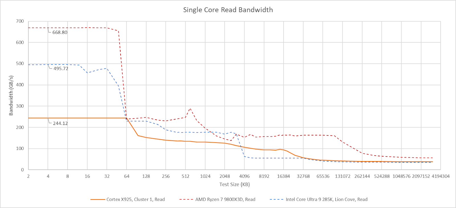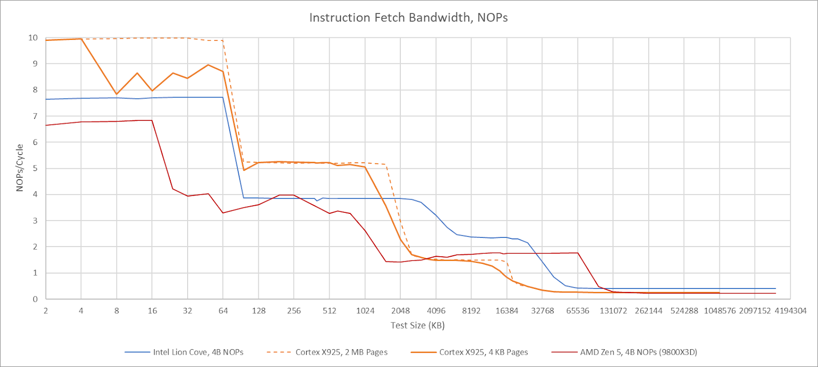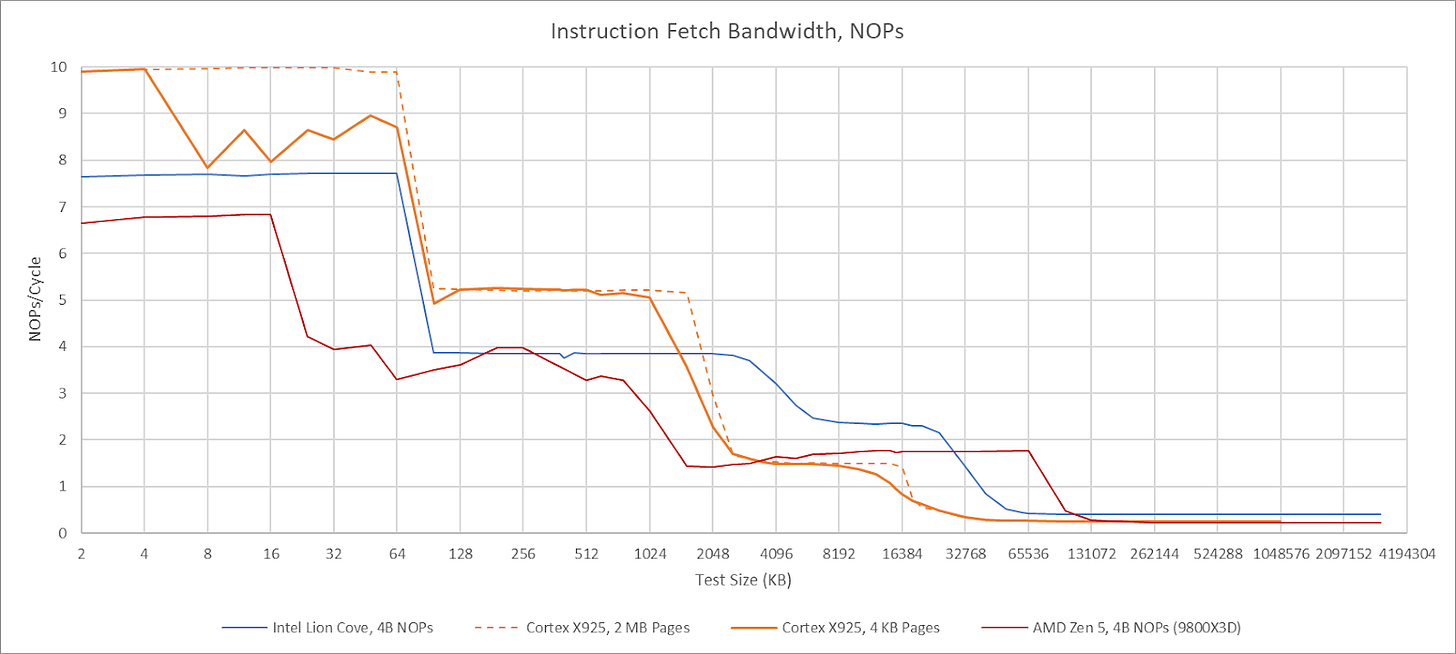 X925’s frontend can sustain 10 instructions per cycle, but strangely has lower throughput when using 4 KB pages. Using 2 MB pages lets it achieve 10 instructions per cycle as long as the test fits within the 64 KB instruction cache. Cortex X925 can fuse NOP pairs into a single MOP, but that fusion doesn’t bring throughput above 10 instructions per cycle. Details aside, X925 has high per-cycle frontend throughput compared to its x86-64 peer, but slightly lower actual throughput when considering Zen 5 and Lion Cove’s much higher clock speed. With larger code footprints, Cortex X925 continues to perform well until test sizes exceed L2 capacity. Compared to X925, AMD’s Zen 5 relies on its op cache to deliver high throughput for a single thread.