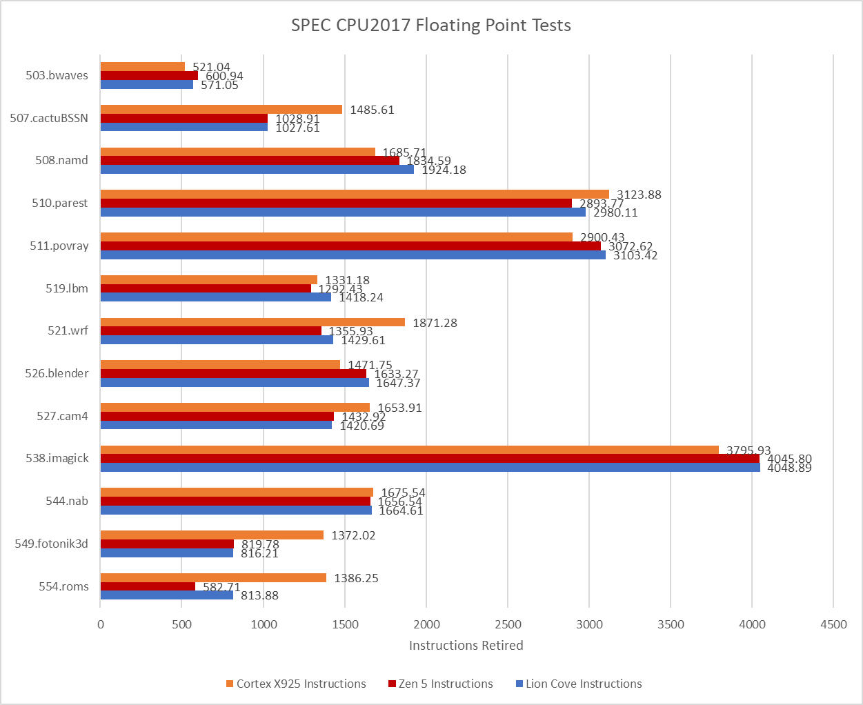 Plotting instruction counts shows just how severe the situation can get for Cortex X925. 507.cactuBSSN, 521.wrf, 549.fotonik3d, and 554.roms all require more instructions on X925, and by no small margin. 554.roms is the worst offender, and makes X925 execute more than twice as many instructions compared to Zen 5. Average IPC in these four tests is nowhere near core width for any of these tested cores, but crunching through extra instructions isn’t the only issue. Higher instruction counts place more pressure on core out-of-order resources, impacting its ability to hide latency.