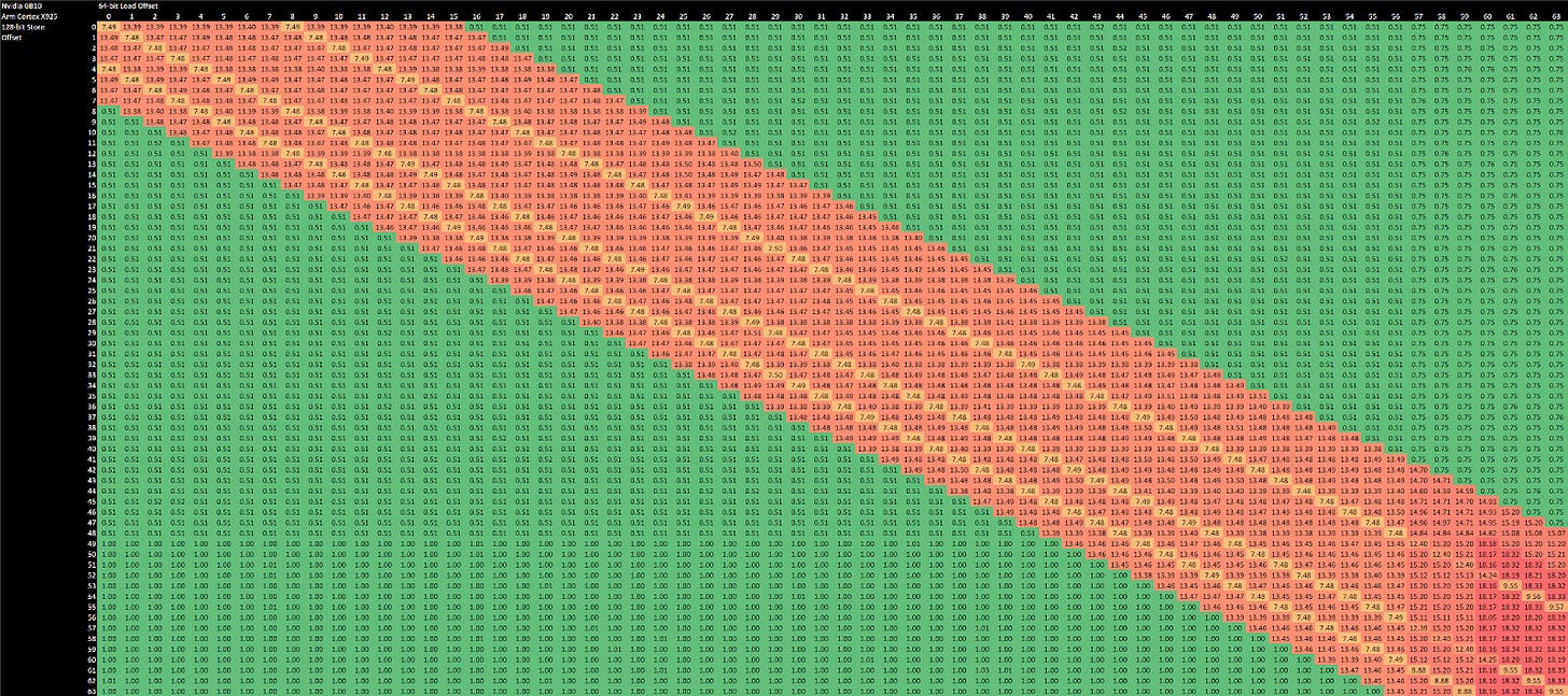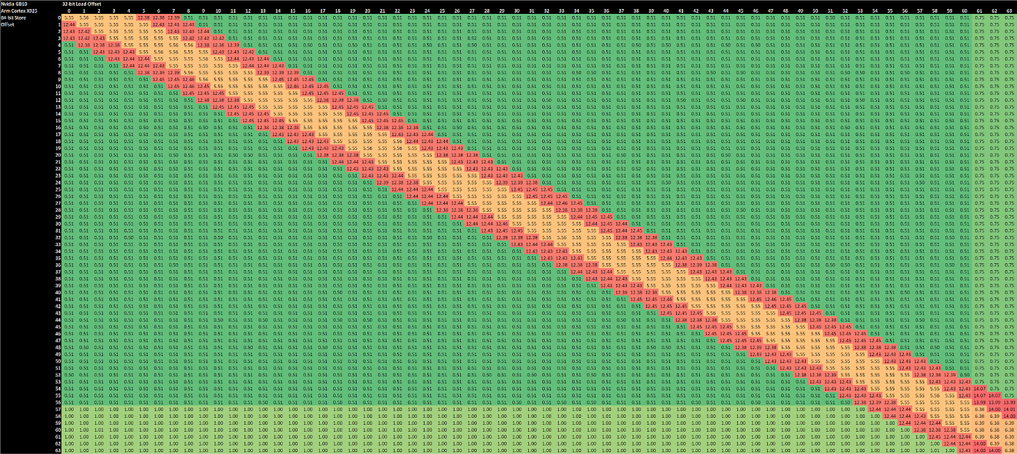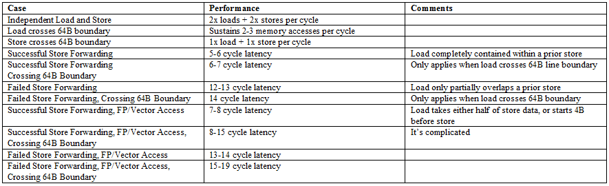 Store forwarding on the integer side works for all loads contained within a prior store. It’s an improvement over prior arm cores like the Cortex X2, which could only forward either half of a 64-bit store to a 32-bit load. Forwarding on the FP/vector side still works like older Arm cores, and only works for specific load alignments with respect to the store address. Unlike recent Intel and AMD cores, Cortex X925 can’t do zero latency forwarding when store and load addresses match exactly. To summarize store forwarding behavior: