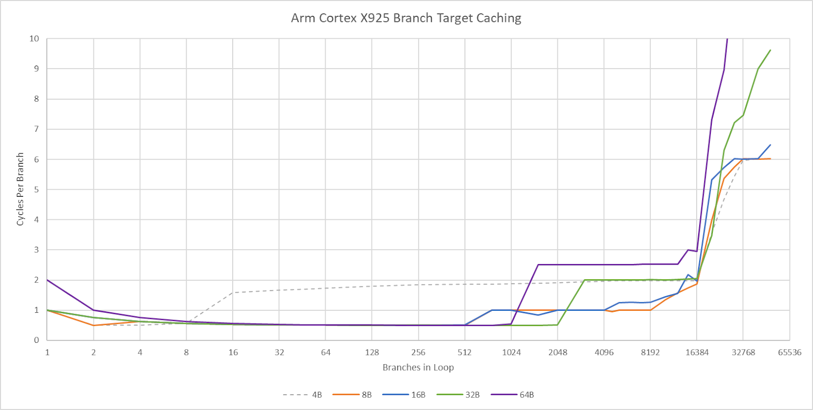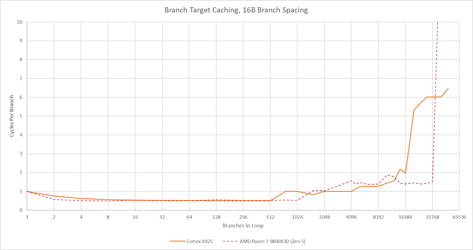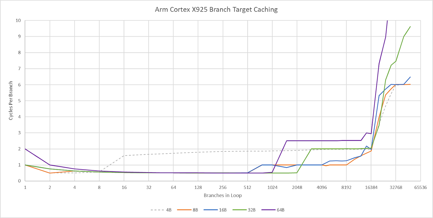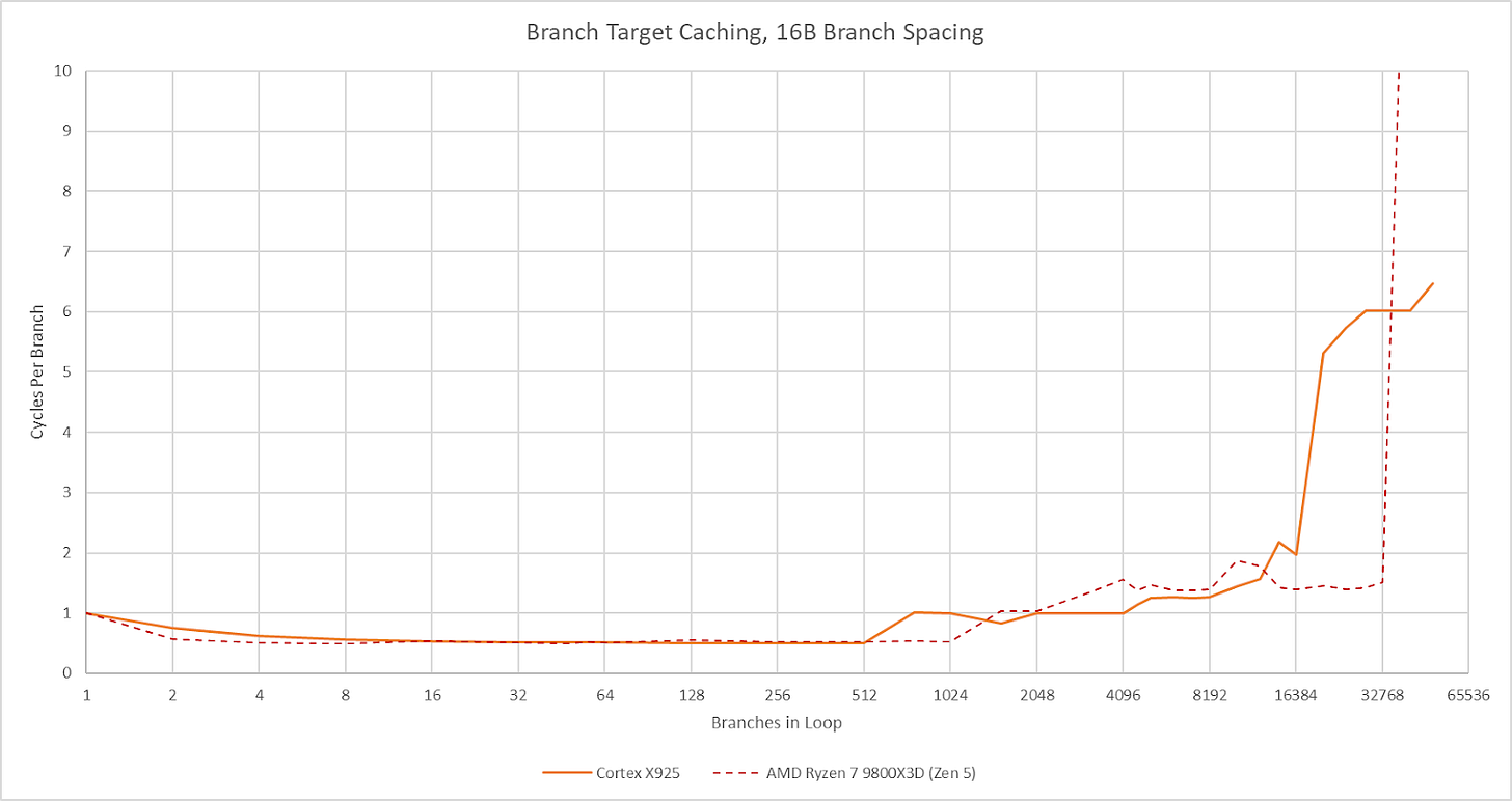 Cortex X925’s branch target caching compares well too. Arm has a large first level BTB capable of handling two taken branches per cycle. Capacity for this first level BTB varies with branch spacing, but it seems capable of tracking up to 2048 branches. This large capacity brings X925’s branch target caching strategy closer to Zen 5’s, rather than prior Arm cores that used small micro-BTBs with 32 to 64 entries. For larger branch footprints, X925 has slower BTB levels that can track up to 16384 branches and deliver targets with 2-3 cycle latency. There may be a mid-level BTB with 4096 to 8192 entries, though it’s hard to tell.