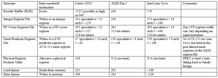 X925’s register files, memory ordering queues, and other resources have comparable capacity to those in Zen 5 and Lion Cove. The only weakness is 128-bit vector execution, with correspondingly wide register file entries. AMD and Intel’s big cores have wider vector registers, and more of them available for renaming.