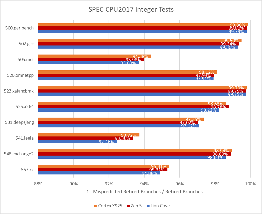 In SPEC CPU2017, Cortex X925 achieves branch prediction accuracy roughly on par with AMD’s Zen 5 across most tests, and may even be slightly ahead. 505.mcf and 541.leela consistently challenge branch predictors, and X925 pulls ahead in both. Intel’s Lion Cove is a bit behind both Zen 5 and X925.