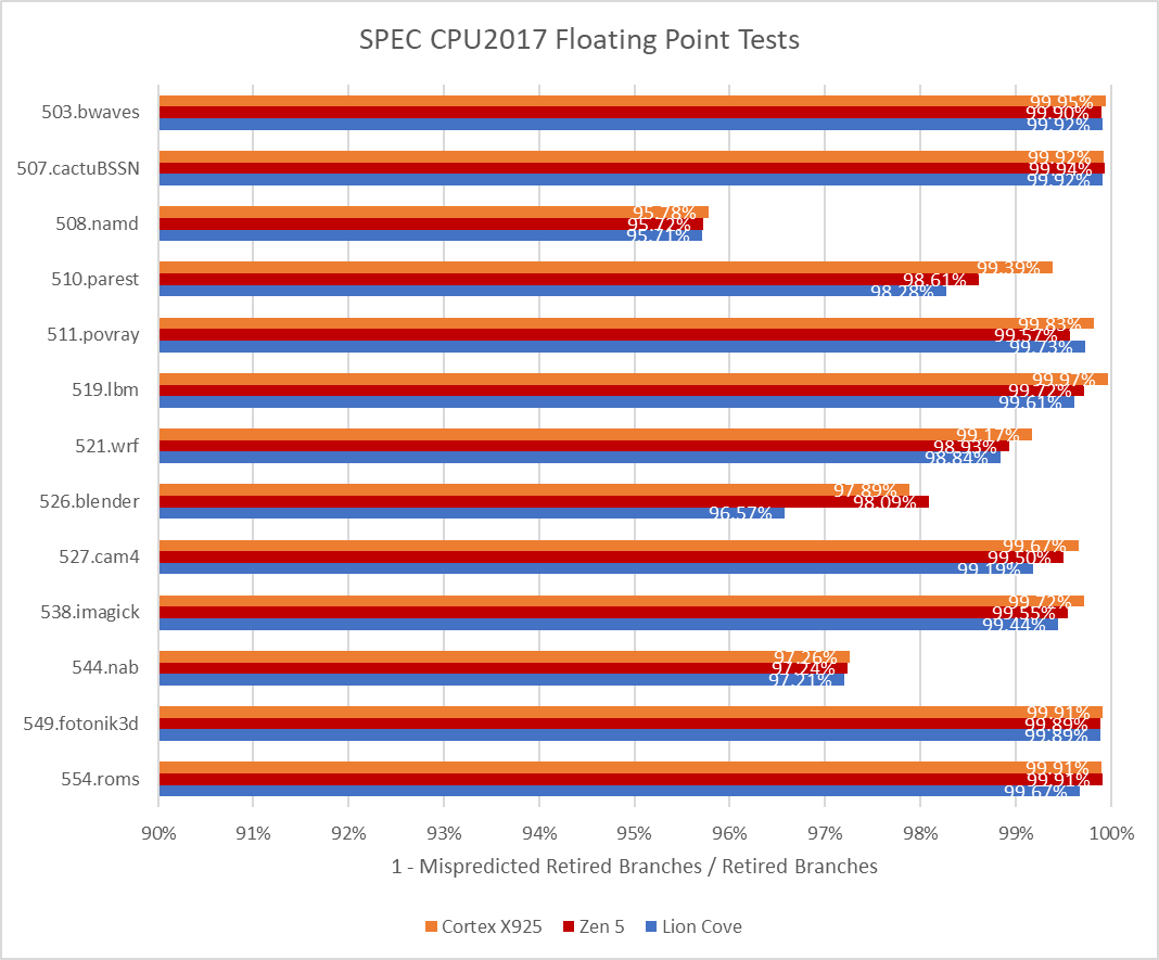 SPEC’s floating point workloads are gentler on the branch predictor, but X925 still shows its strength. It’s again on par or slightly better than Zen 5.