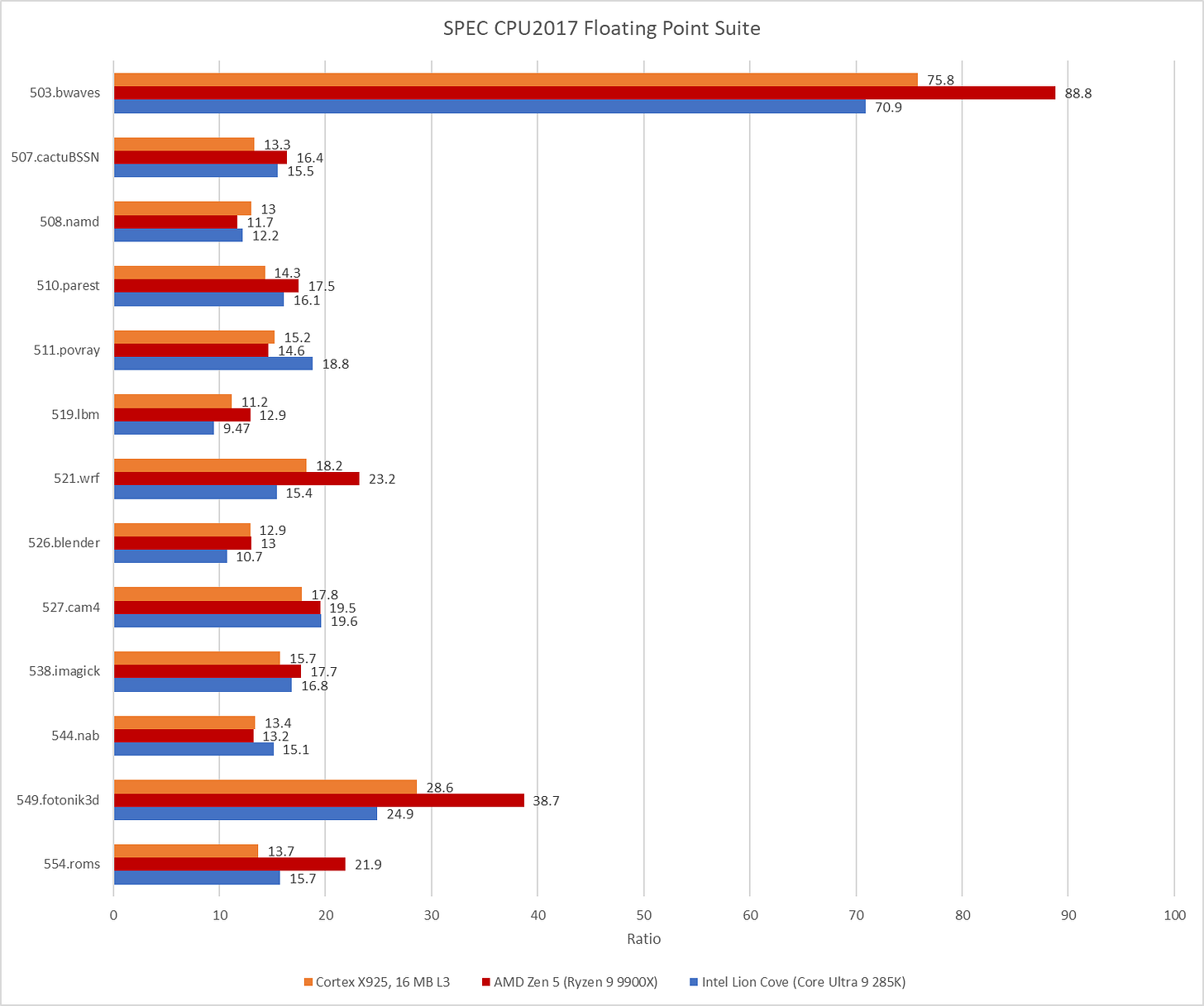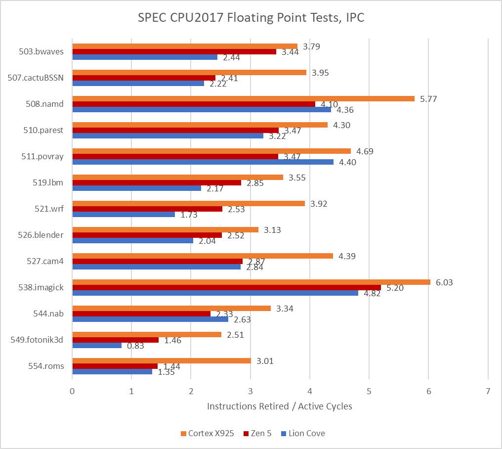 SPEC CPU2017’s floating point workloads throw a wrench into the works. Cortex X925 falls behind Zen 5 on enough tests to leave AMD’s latest and greatest core with a clear victory. In Arm’s favor, they are able to keep pace with Intel’s Lion Cove.