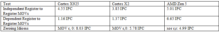 MOPs from the frontend go through register renaming and have various bookkeeping resources allocated for them, letting the backend carry out out-of-order execution while ensuring results are consistent with in-order execution. While allocating resources, the core can carry out various optimizations to expose additional parallelism. X925 can do move elimination like prior Arm cores, and has special handling for moving an immediate value of zero into a register. Like on A725, the move elimination mechanism tends to fail if there are enough register-to-register MOVs close by. Neither optimization can be carried out at full renamer width, though that’s typical as cores get very wide.