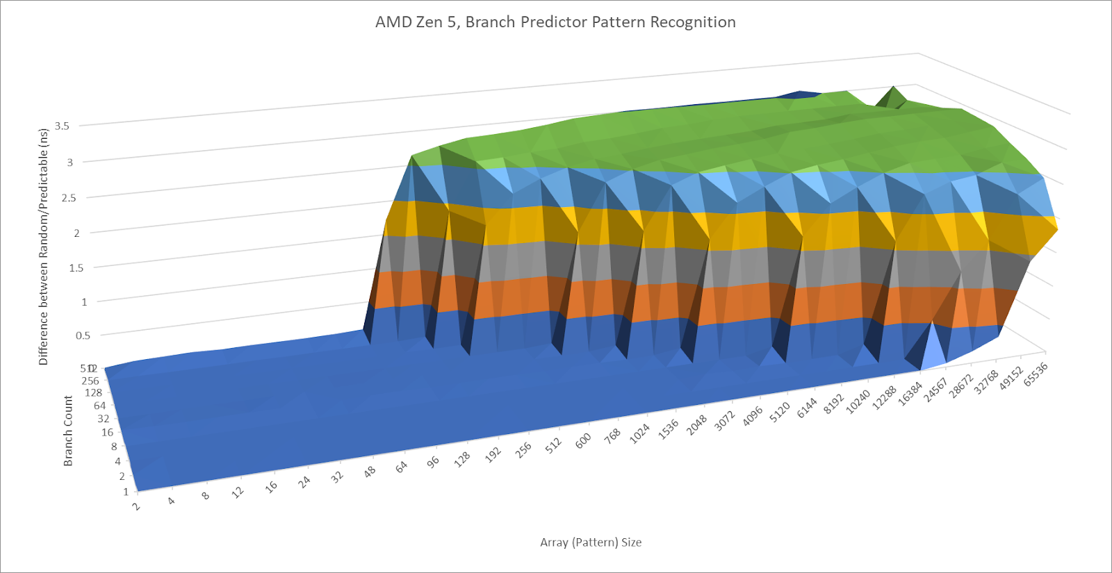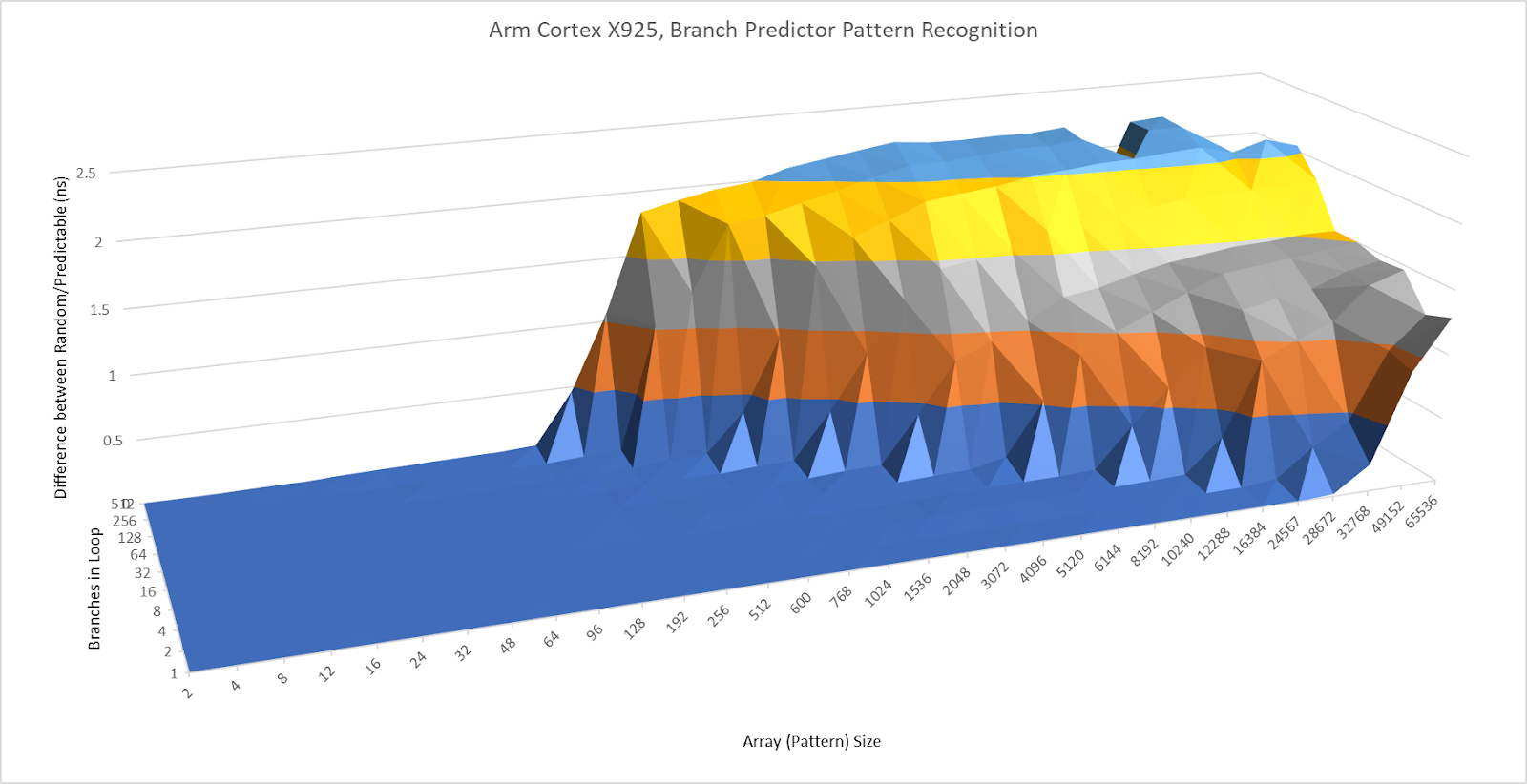 Performance and power efficiency starts with good branch prediction. Arm knows this, and X925 doesn’t disappoint. Its branch predictor can recognize extremely long repeating patterns. In a test with branches that are taken or not-taken in random patterns of increasing lengths, X925 behaves a lot like AMD’s Zen 5. AMD’s cores have featured very strong branch predictors since Zen 2, so X925’s results are impressive.
