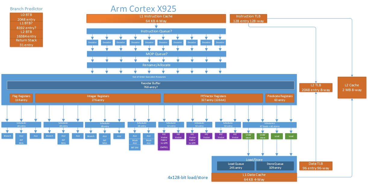Cortex X925 ditches the MOP cache from prior Arm generations, much like mid-core companion (A725). While Cortex X925 doesn’t have the same tight power and area restrictions as A725, many of the same justifications apply. Arm already tackles decode costs through a variety of measures like predecode and running at lower clock speeds. A MOP cache would be excessive.