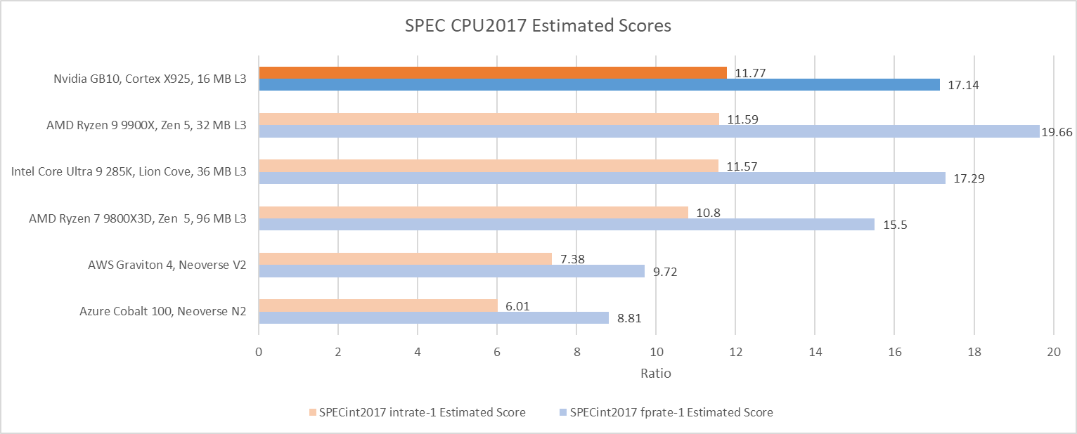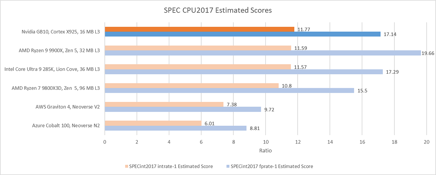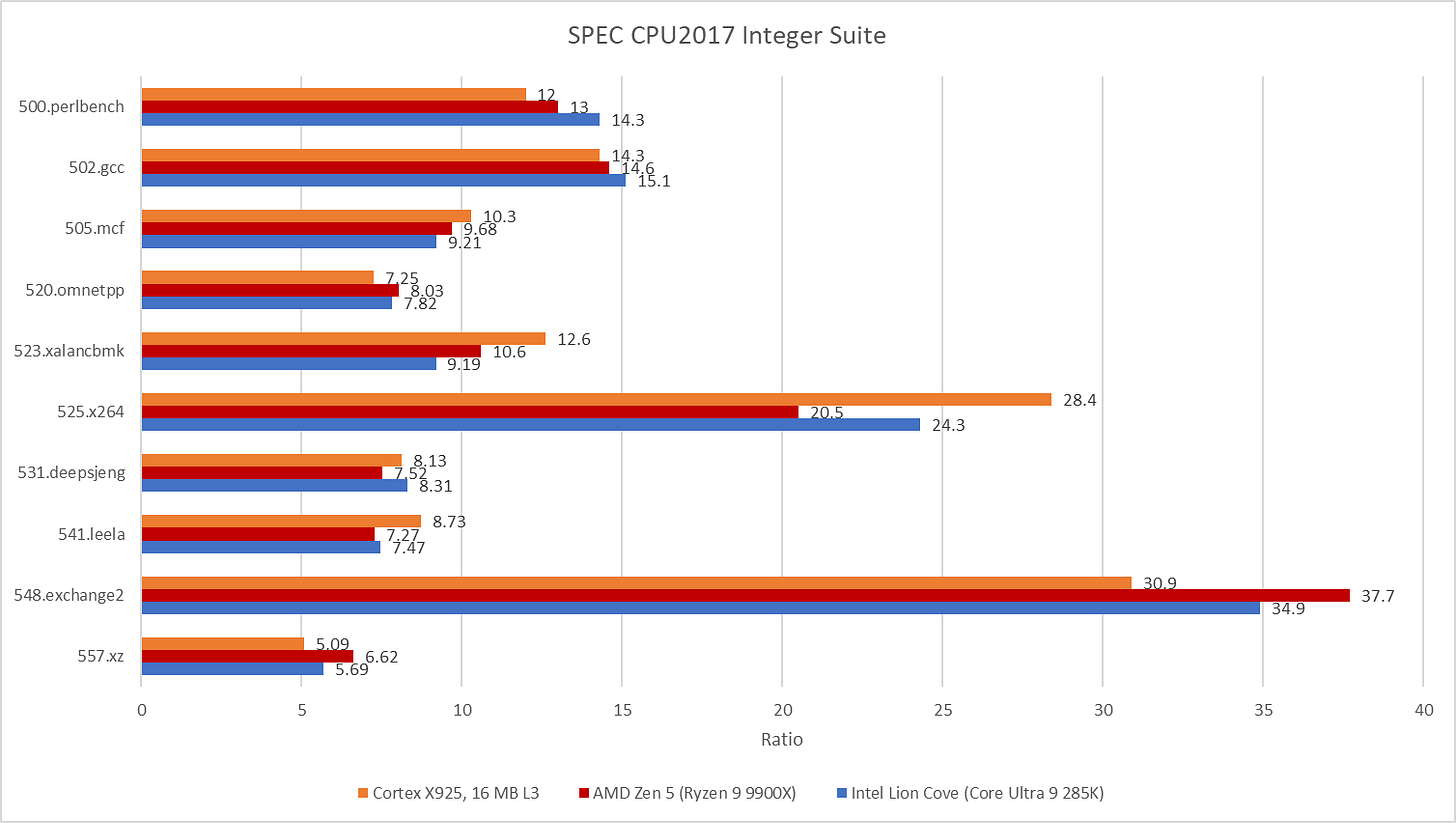 Cortex X925 turns in an excellent performance in SPEC CPU2017’s integer suite. Its score in the integer suite is within margin of error compared to Intel and AMD’s highest performance cores, in their highest performance desktop configurations. AMD’s Zen 5 still slips ahead in SPEC’s floating point suite, but not by a large margin. Running Zen 5 with faster DDR5-6000 instead of DDR5-5600 memory can slightly increase its integer score, but only to 11.9 - not enough to pull away from X925. Creating a high performance core involves making the right tradeoff between frequency and performance per clock, while keeping everything else in balance. It’s safe to say Arm has found a combination of frequency and performance per clock that lets them compete with AMD and Intel’s best.