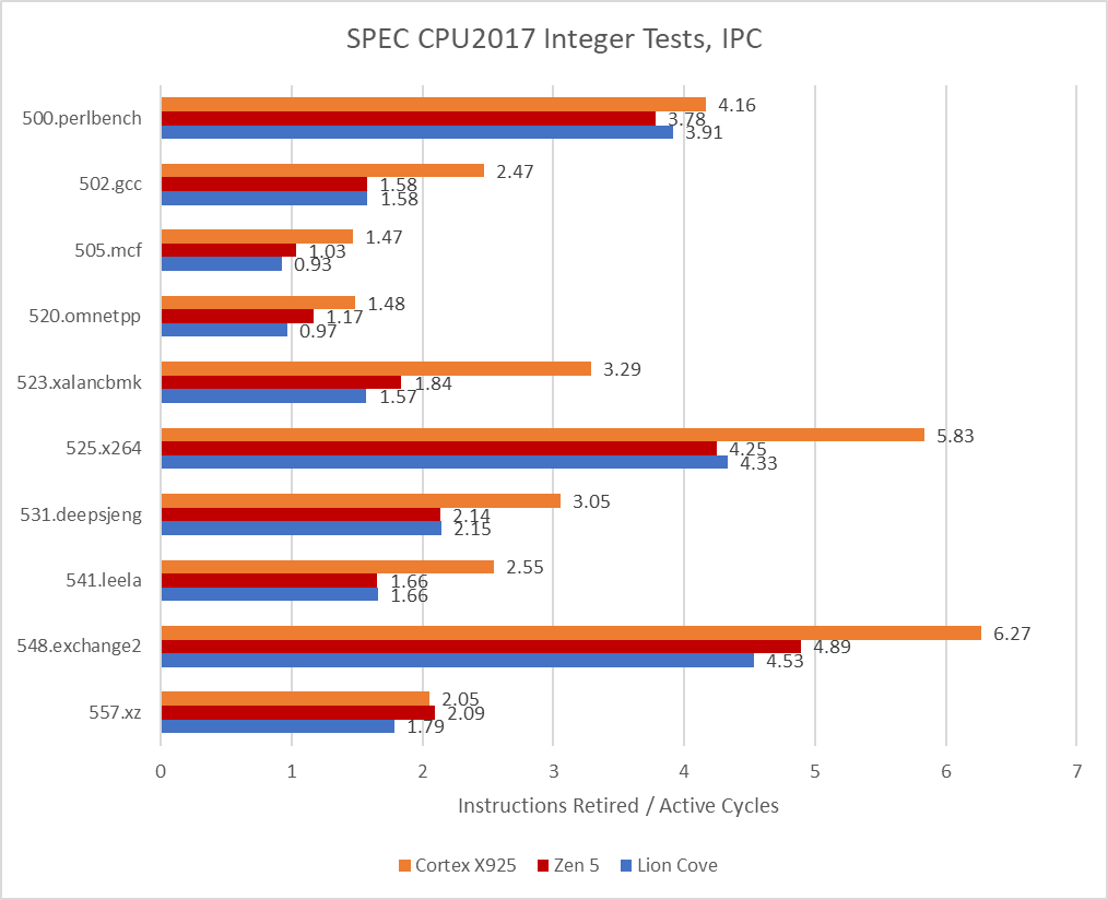 PMU data indicates X925 is able to maintain higher IPC relative to the competition. Unfortunately for X925, several tests require many more instructions to complete with the aarch64 instruction set compared to x86-64. Arm needs a large enough IPC advantage to overcome both a clock speed deficit and a less efficient representation of the work. Cortex X925 does achieve high IPC, but it’s not high enough.