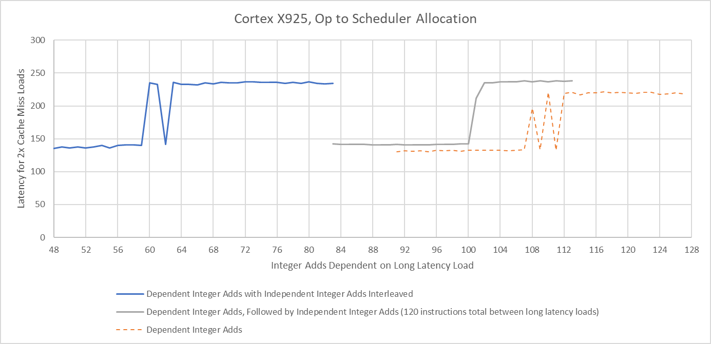 Thanks to symmetry across the integer schedulers, X925’s renamer likely uses a simple round-robin allocation scheme for operations that can go to multiple schedulers. If I test scheduler capacity by interleaving dependent and independent integer adds, X925 can only keep half as many dependent adds in flight. Following dependent adds by independent ones only slightly reduces measured scheduling capacity. That suggests the renamer assigns a scheduler for each pending operation, and stalls if the targeted scheduling queue is full without scanning other eligible schedulers for free entries.
