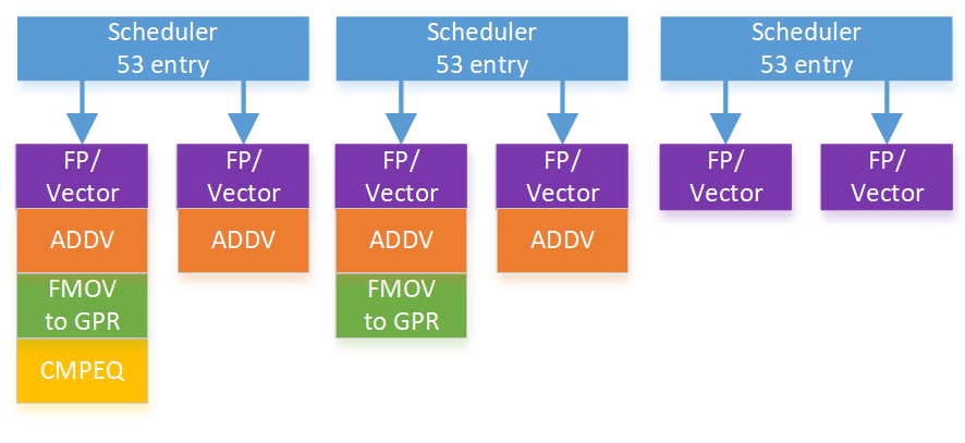 Cortex X925’s FPU has six pipes, all of which can handle vector floating point adds, multiplies, and multiply-adds. All six pipes also support vector integer adds and multiplies. Less common instructions like addv are still serviced by four pipes. X925’s FP schedulers are impressively large with approximately 53 entries each. For perspective, each of X925’s three FP schedulers has nearly as much capacity as Bulldozer’s 60 entry unified FP scheduler. Bulldozer used that scheduler to service two threads, while X925 uses its three FP schedulers to service a single thread.