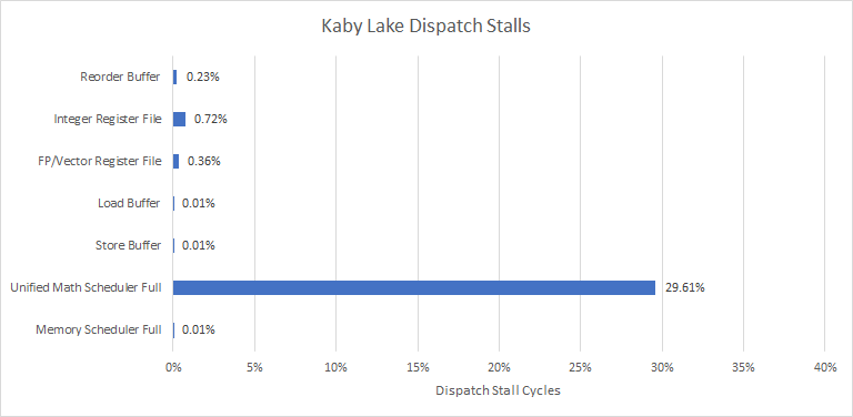 Kaby Lake’s port utilization is in a good place, with heavy but not overwhelming load on the two FP pipes. Execution latency is more of an issue than port count, even though Kaby Lake has fewer FP ports compared to contemporary AMD CPUs.