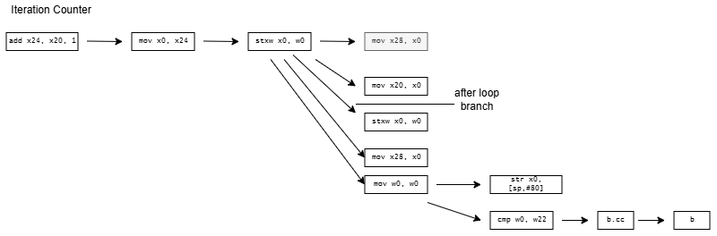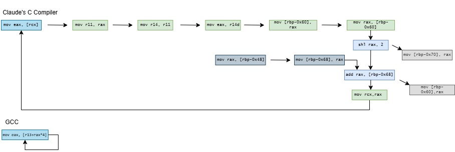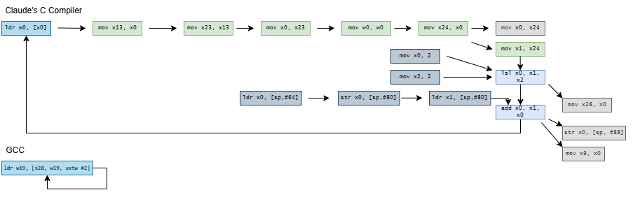CCC doesn’t stop there and exceeds quotas by decomposing current = A[current] into a nine instruction dependency chain. On x86-64, it shuffles the index through several registers and sends it on a trip through the stack. It does the same on aarch64, but at least keeps the index in registers. On both architectures, CCC brings the array base address in from the stack, and sends it on another round trip through the stack for good measure before using it.