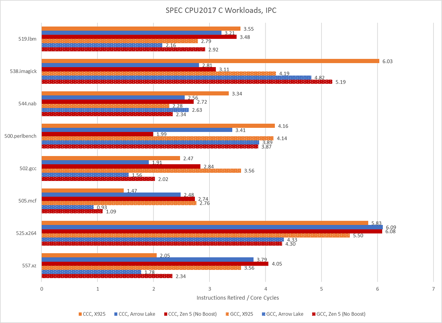 Performance is overrated. Analysts today agree that IPC is more important than performance, and CCC code achieves excellent IPC. On 525.x264, Arrow Lake averages 6.09 IPC when running CCC code. That’s the highest IPC average across all SPEC CPU2017 runs above. GCC’s best IPC average tops out at a wimpy 5.5. CCC’s IPC advantage isn’t universal though, and GCC does manage higher IPC on 538.imagick.