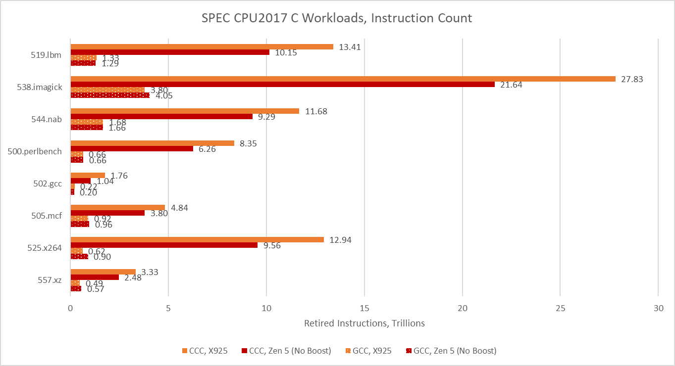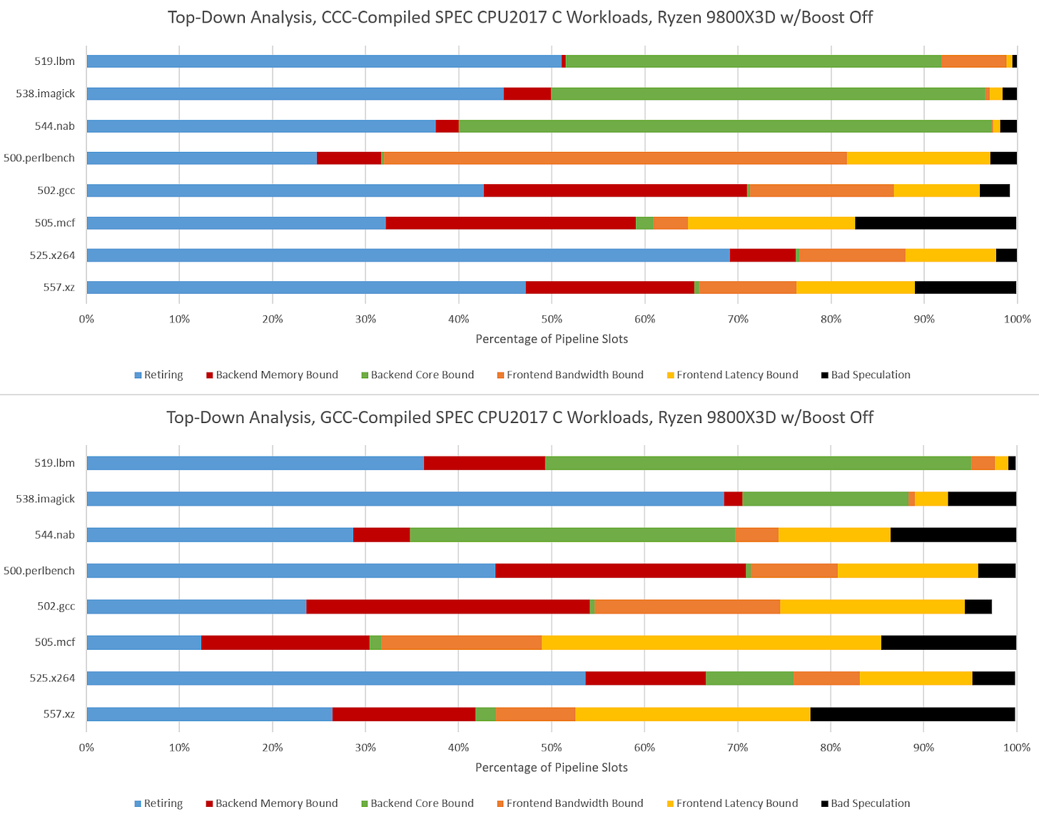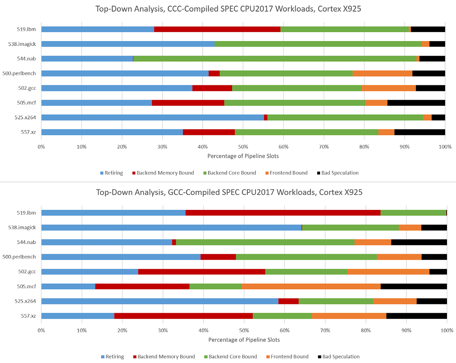 Hardware performance monitoring reveals a different set of challenges for the CPU pipeline when comparing GCC- and CCC-compiled code. Branch prediction is less important because branch count didn’t grow proportionately to total instruction count. SPEC CPU2017’s three C-only floating point workloads become very core-bound when built with CCC. On Zen 5, that means retirement is blocked by an instruction that doesn’t read from memory. That indicates performance is limited by how fast the core can execute instructions, rather than how fast the memory subsystem can feed the core with data. The five integer workloads become less frontend bound, and face steeper backend challenges. CCC workloads across the board achieve higher core utilization than their GCC-compiled counterparts, as the IPC figures from before suggest.