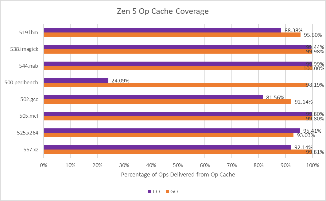 500.perlbench is a catastrophically bad case for Zen 5 when compiled with CCC because of a much lower op cache hitrate. Zen 5 primarily feeds itself with a 6K entry, 16-way op cache, which can fully feed the 8-wide rename/allocate stage. 4-wide, per-thread decoders handle larger instruction footprints. Typically applications with poor code locality suffer from other IPC limiters besides frontend throughput, especially when the core isn’t running a second thread that can hide latency. 500.perlbench has higher IPC potential if not for the per-thread decode throughput limitation, putting Zen 5 behind X925 and very far behind Lion Cove. It’s the first case I’ve seen outside a microbenchmark where Zen 5’s decoder arrangement comes out to bite. Zen 5’s op cache manages high coverage in other workloads, so 500.perlbench is an exceptional case.