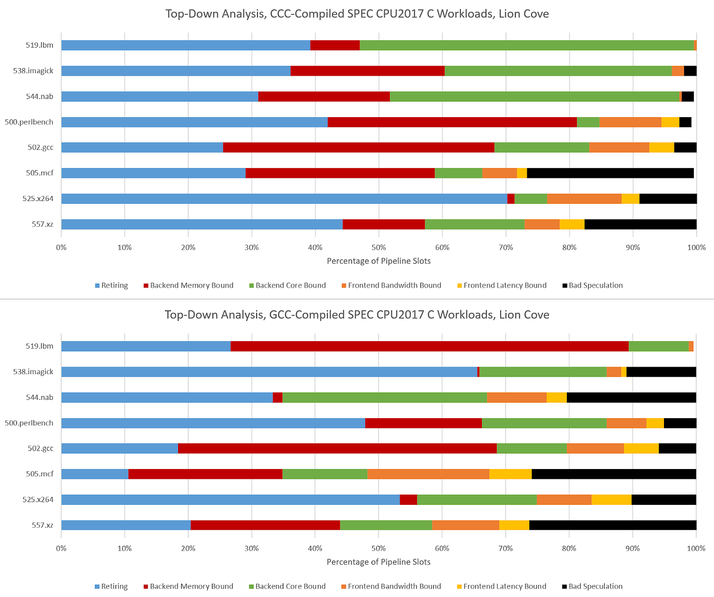 CCC challenges Lion Cove’s pipeline in a similar fashion, though Lion Cove is generally more backend bound than Zen 5. This could be because Lion Cove sits atop a higher latency uncore. Or, the difference could be down to accounting methodology. For example, Intel might be counting cycles where any instruction is delayed by a load as “memory bound”, which could lead to higher counts than AMD’s approach. Lion Cove’s 8-wide decoder excels in 500.perlbench, where frontend limitations are minor compared to what they were in Zen 5.