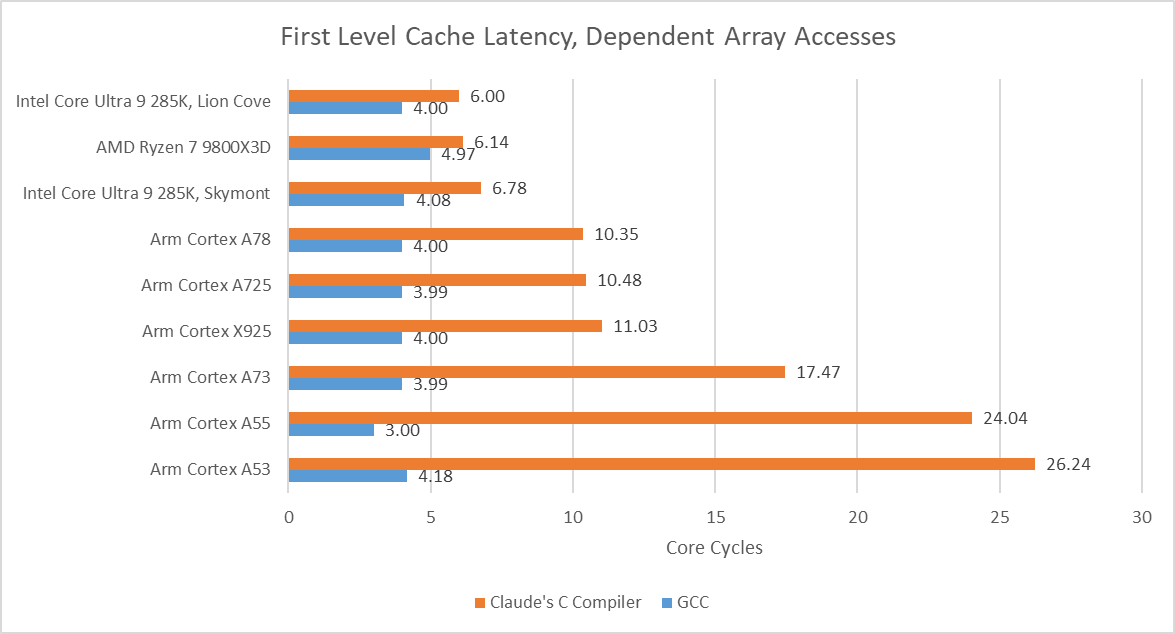 CCC, or Claudes’ C Compiler, is a “from-scratch optimizing compiler with no dependencies […] able to compile the Linux kernel.” Anthropic used their Claude large language model (LLM) to write the entire compiler. Human effort was relegated to prompting and maintaining AI coding agents, and standing up a very robust test suite to keep those coding agents on track. Past Chips and Cheese articles used microbenchmarks and benchmarks built using GCC. GCC was developed by humans, which is backwards and reactionary by the standards of many cadres today. Comparing GCC and CCC should be a powerful showcase of revolutionary software development practices.