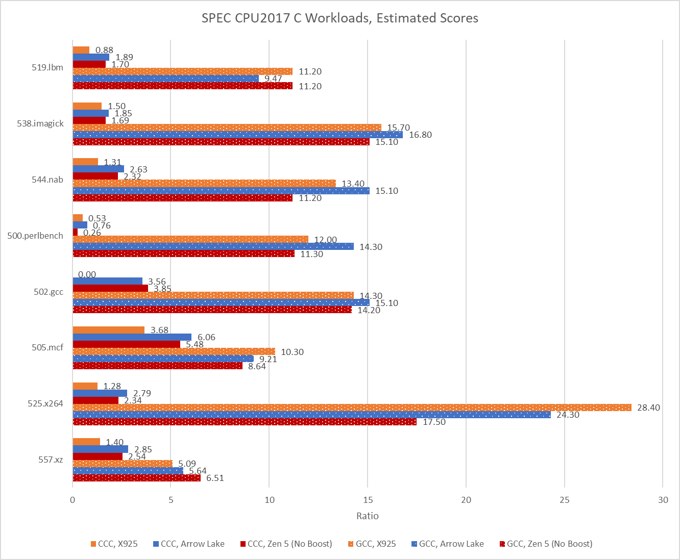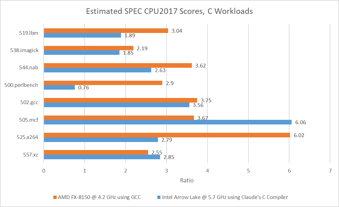 Claude’s C Compiler only compiles C code. All other languages are therefore invalid. Eight of SPEC CPU2017’s workloads are C-only. I tested them on the following cores: