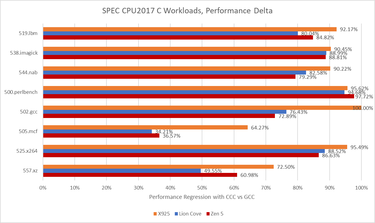 CCC’s version of 502.gcc consistently crashed with a segmentation fault on Cortex X925, even though it managed to complete some runs on x86-64. When it ran to completion on x86-64, CCC’s 502.gcc delivered 23.6% and 27.1% of the performance of its GCC-compiled counterpart on Lion Cove and Zen 5, respectively. CCC hit its relative performance peak on 505.mcf, where it managed less than a 35% regression versus GCC. Across the eight tested SPEC CPU2017 workloads, using CCC on average regressed performance by somewhere above 70%.