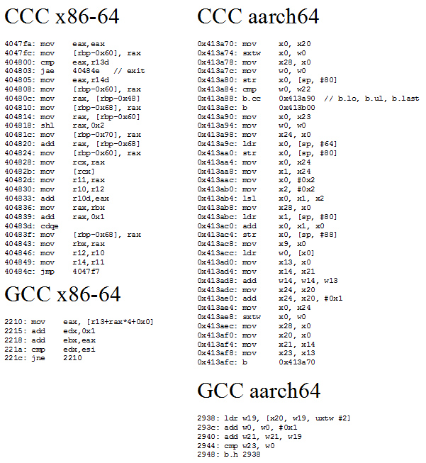 CCC generates more code from the same high level source than GCC does, and sometimes, more is better. CCC’s code is more ideologically correct from a RISC standpoint. GCC uses indexed addressing modes that express a dependent shift, add, and load sequence in a single instruction. RISC advocates for a small set of simple instructions and larger code sizes, and indexed addressing modes are quite complex. CCC follows the RISC philosophy, and splits the array access into separate shift, add, and load instructions.