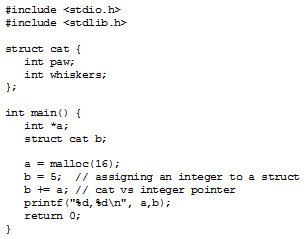 Old, traditional compilers force the masses to follow a tight set of rules dreamt up by the bourgeoisie. If a programmer doesn’t follow these rules, the compiler will complain and may even refuse to complete the compilation process. Warnings and errors are of no use to the proletariat, who just want results. CCC boldly crushes type systems with revolutionary fervor, as if to shout “out with the old, in with the new!” Take the following code: