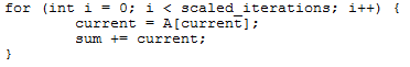 A = A[current] creates a dependency chain where one array access result feeds into the next, preventing accesses from overlapping even on an out-of-order core. Dividing access time by iteration count gives latency. CCC and GCC compile the loop into the following assembly code: