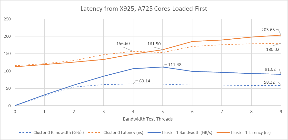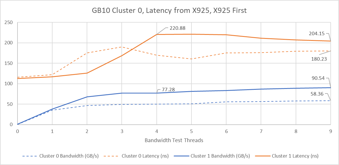 Both clusters hit their maximum bandwidth figures with all A725 generating bandwidth load. Adding bandwidth demands from X925 cores decreases aggregate bandwidth while pushing latency up. Reversing the core load order suggests the X925 cores specifically cause contention in the memory subsystem. Latency reaches a maximum with four X925 cores asking for as much bandwidth they can get. It’s almost like the X925 cores don’t know when to slow down to avoid monopolizing memory subsystem resources. When the A725 cores come into play, GB10 seems to realize what’s going on and starts to balance bandwidth demands better. Bandwidth improves, and surprisingly, latency does too.