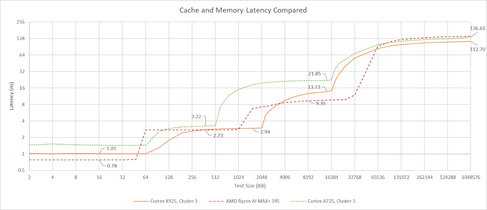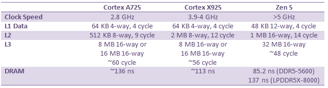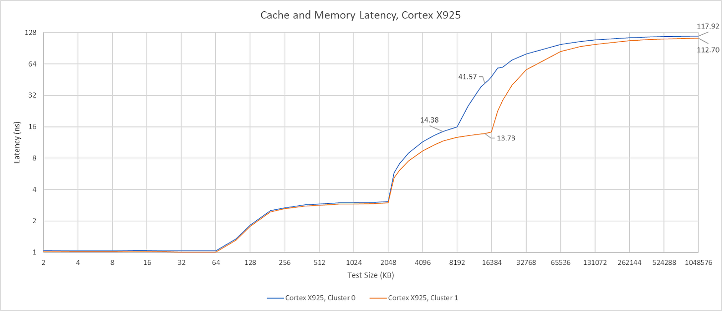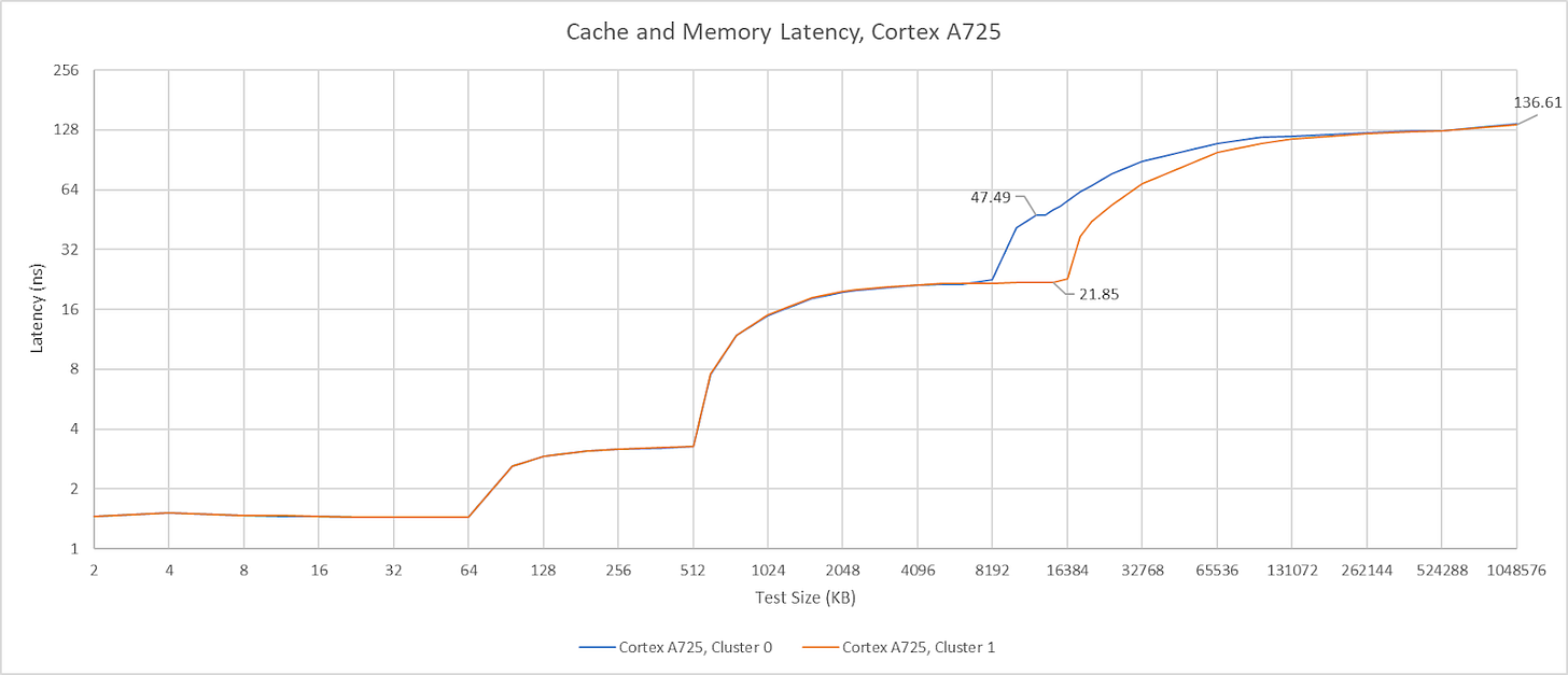 Both Cluster 0 and Cluster 1 have the same core configuration of five X925 cores and five A725 cores. The X925 cores focus on the highest performance whereas the A725 cores focus on density. As a result the A725 cores feel out of place on a high performance cluster, especially with 512 KB of L2 in front of a L3 with over 20 ns of latency.