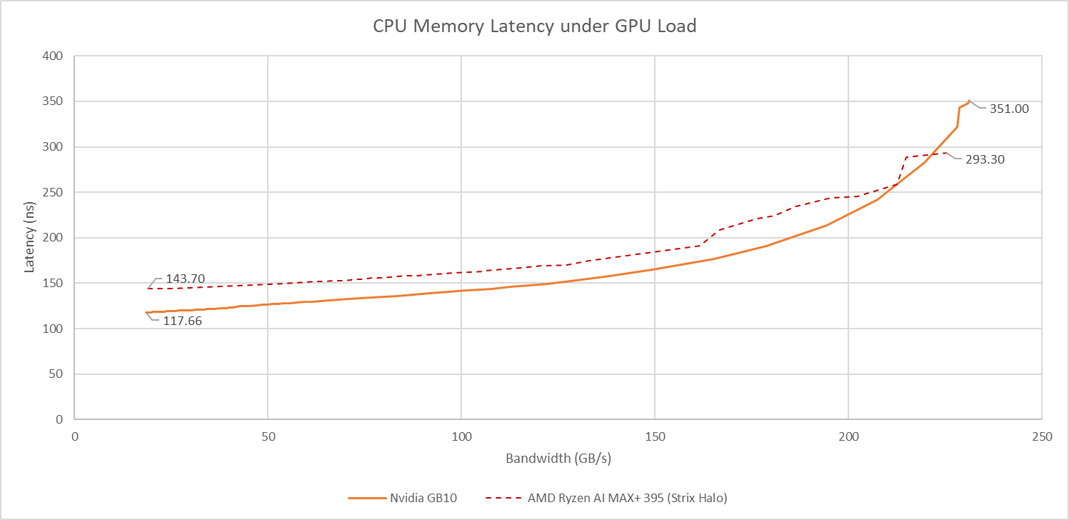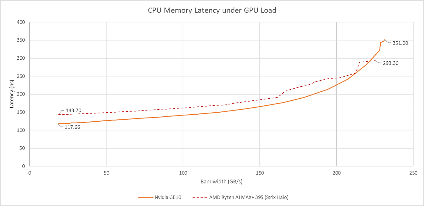CPU-side bandwidth is another interesting detail, and has a lot of common traits across both chips. CPU cores can’t access full LPDDR5X bandwidth on both GB10 and Strix Halo. The 256-bit memory bus is aimed at feeding the GPU, not the CPU. High GPU bandwidth demands can squeeze out the CPU in both memory subsystems. Perhaps Nvidia/Meditek and AMD both optimized for workloads that don’t simultaneously demand high CPU and GPU performance.